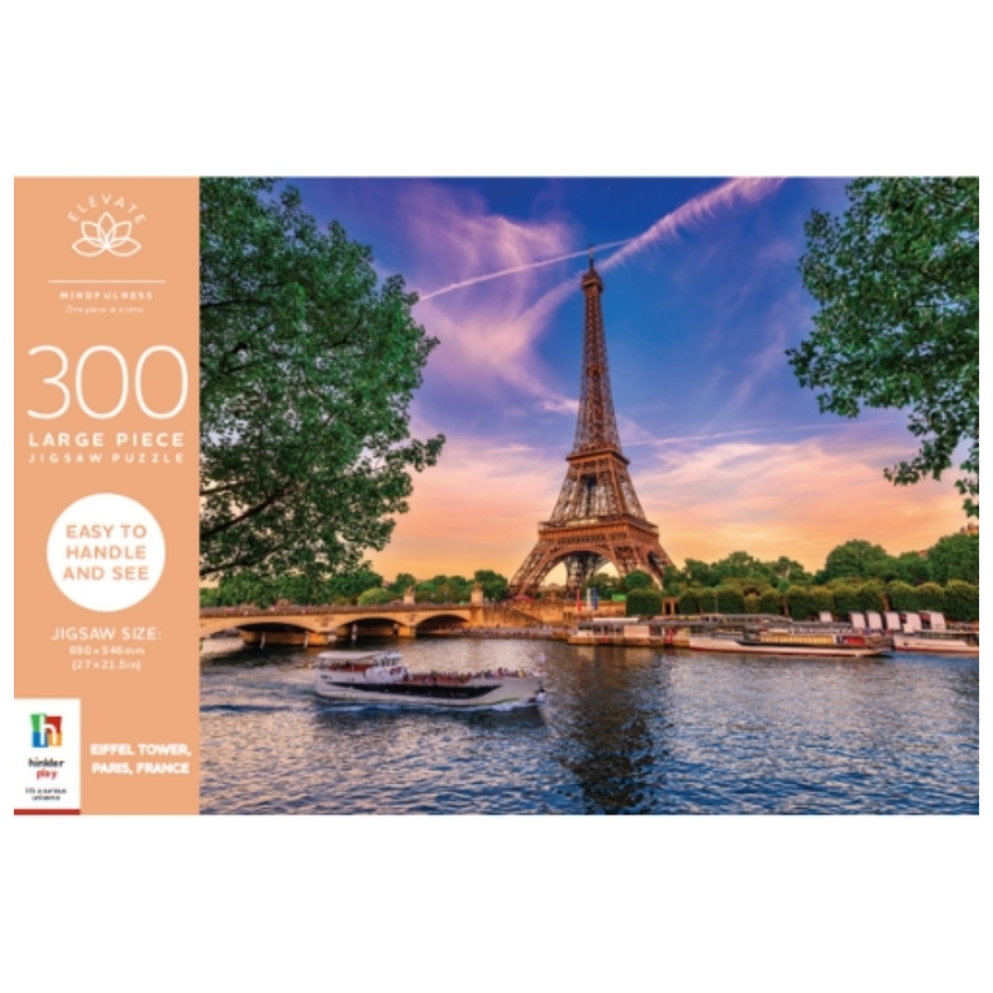 Experience the allure of Paris from the comfort of your home with the Elevate 300pc Jigsaw: Eiffel Tower Paris, France. The puzzle's large pieces allow you to appreciate the beauty of the City of Lights without straining your eyes, and they are easy to handle and interlock to allow for an enjoyable, peaceful experience. Use the reference image printed on the inside of the box lid, or if you need a little more help, there's a double-sided actual-size reference poster with and without the jigsaw pattern.