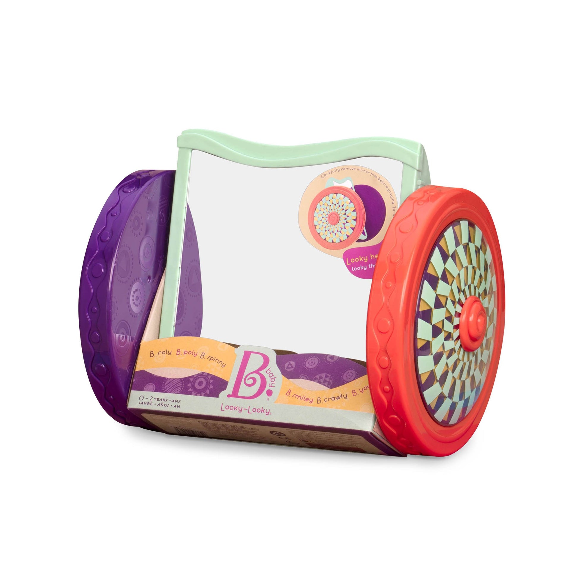 A colorful roly-poly mirror that stays upright when pushed. Two big wheels keep the mirror spinning across the floor as crawlers give chase. One wheel rattles with beads, while the other wows with a spirally design.