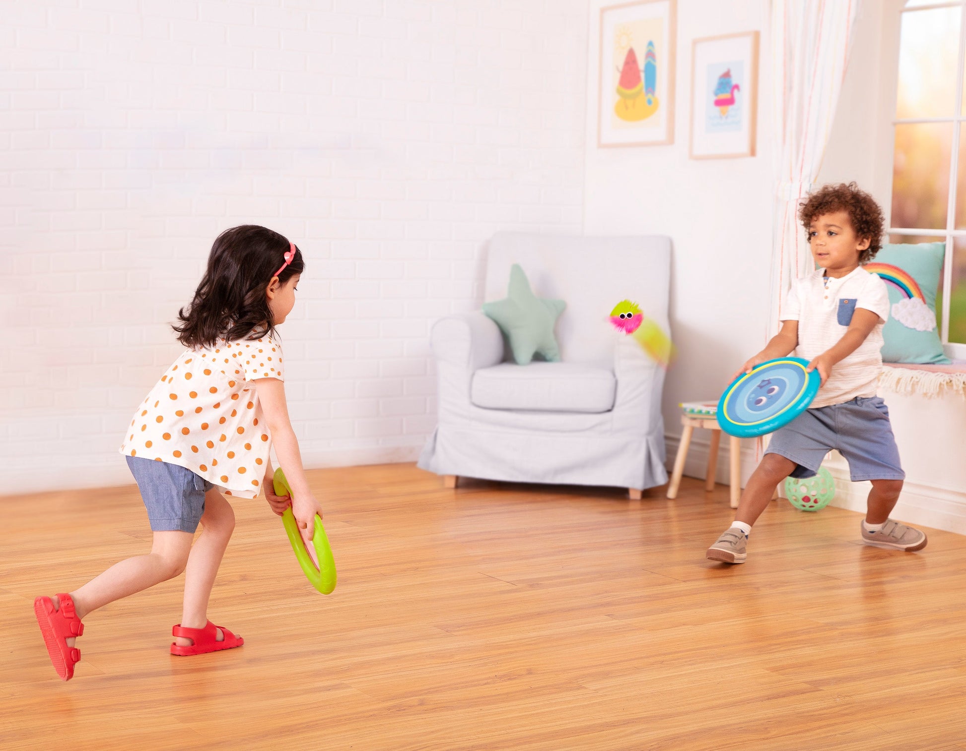 Unleash the fun in the backyard or on the beach with the Poppin’ Paddles from B. toys! This paddle ball set comes with 2 hand trampolines and 2 balls that kids can use in a variety of ways. Pop the wacky ball from paddle to paddle, toss ’em like a flying disc, put a unique spin on classics like tennis and volleyball, or make a splash in the pool – these waterproof paddles float! On top of keeping little ones active, this game also improves gross motor skills and hand-eye coordination. And because we at B. keep the environment in mind, parents will be happy to know that our packaging is 100% recyclable. Recommended for children 3 years and over.