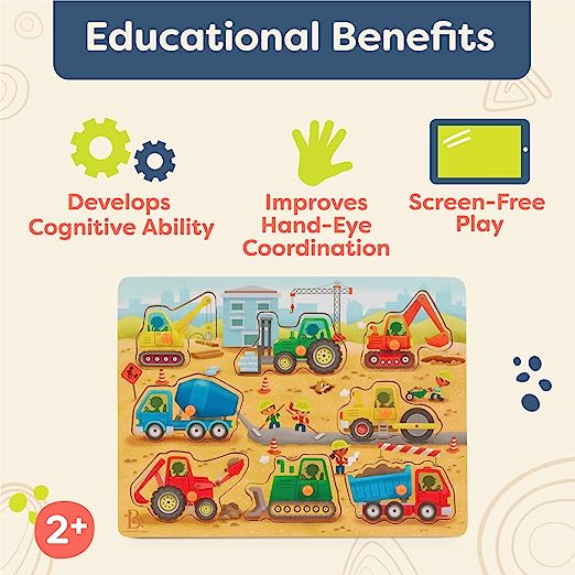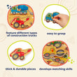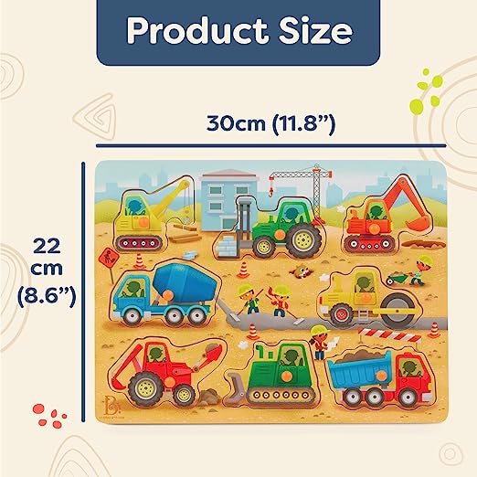 Wooden puzzle construction trucks ''Peek & Explore''. Learn to recognize different construction vehicles by trying to place the colored pieces on the board.