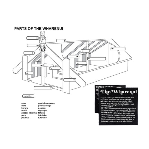 Learn about the wharenui through hands-on experience. This Build Your Own Wharenui set contains labeled parts and activities that you and your children can do. As you construct the building, you can learn about the different aspects of the marae and their meanings.