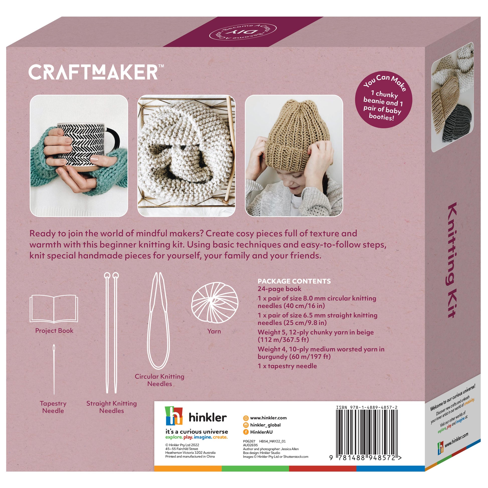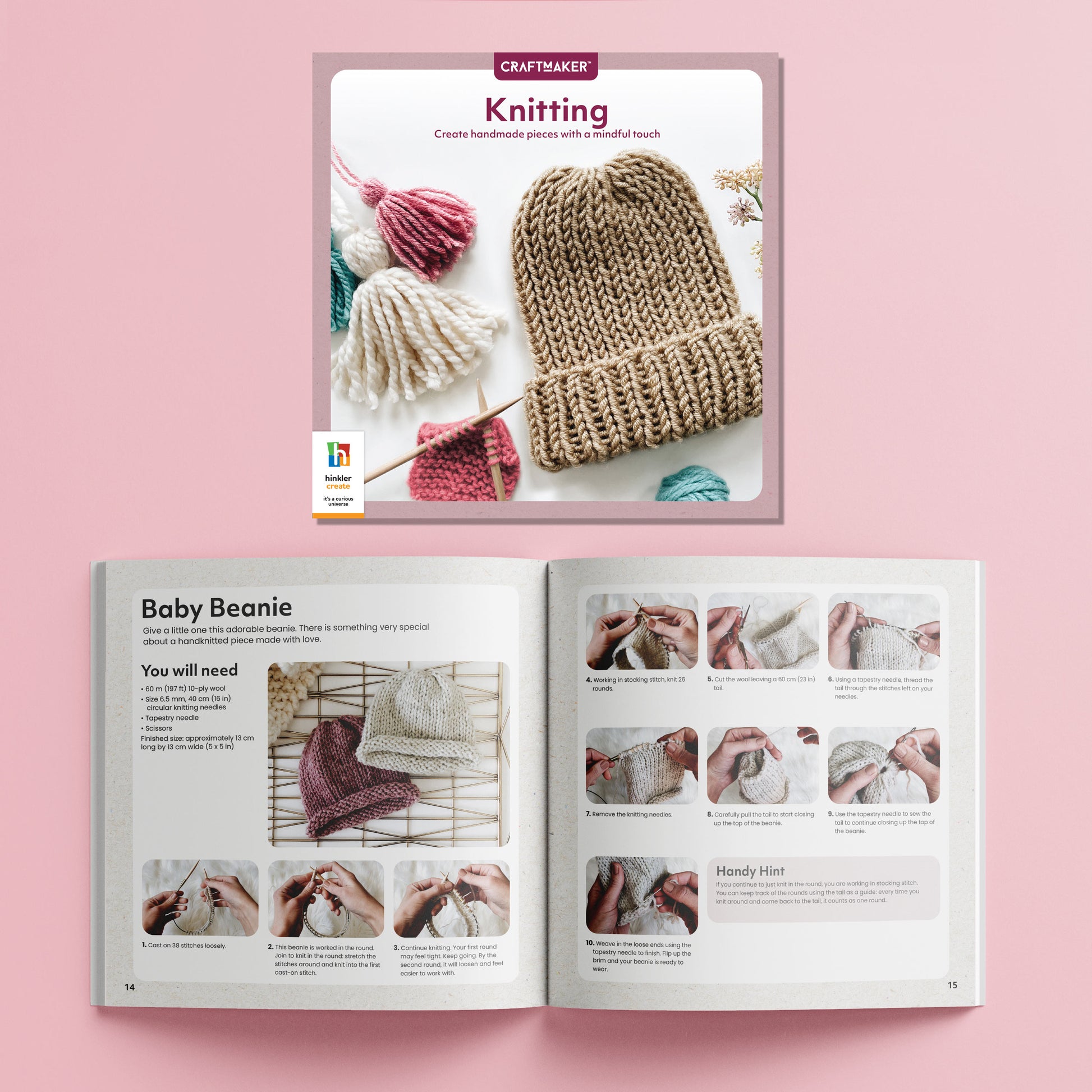 Use the materials included to knit a chunky adult beanie and a super-sweet pair of baby