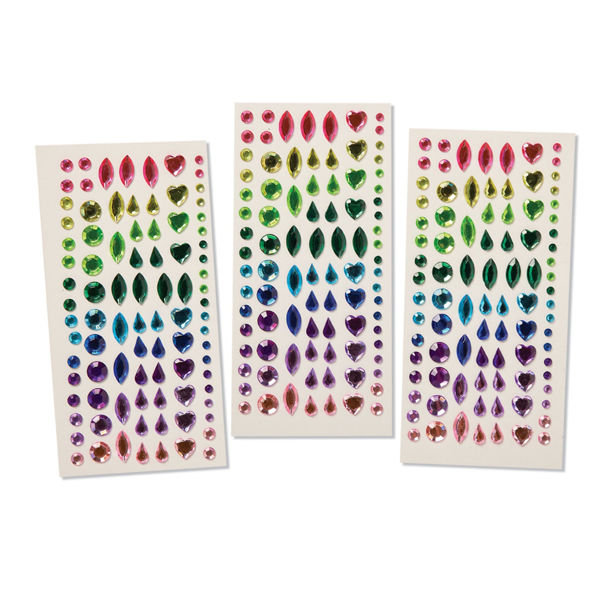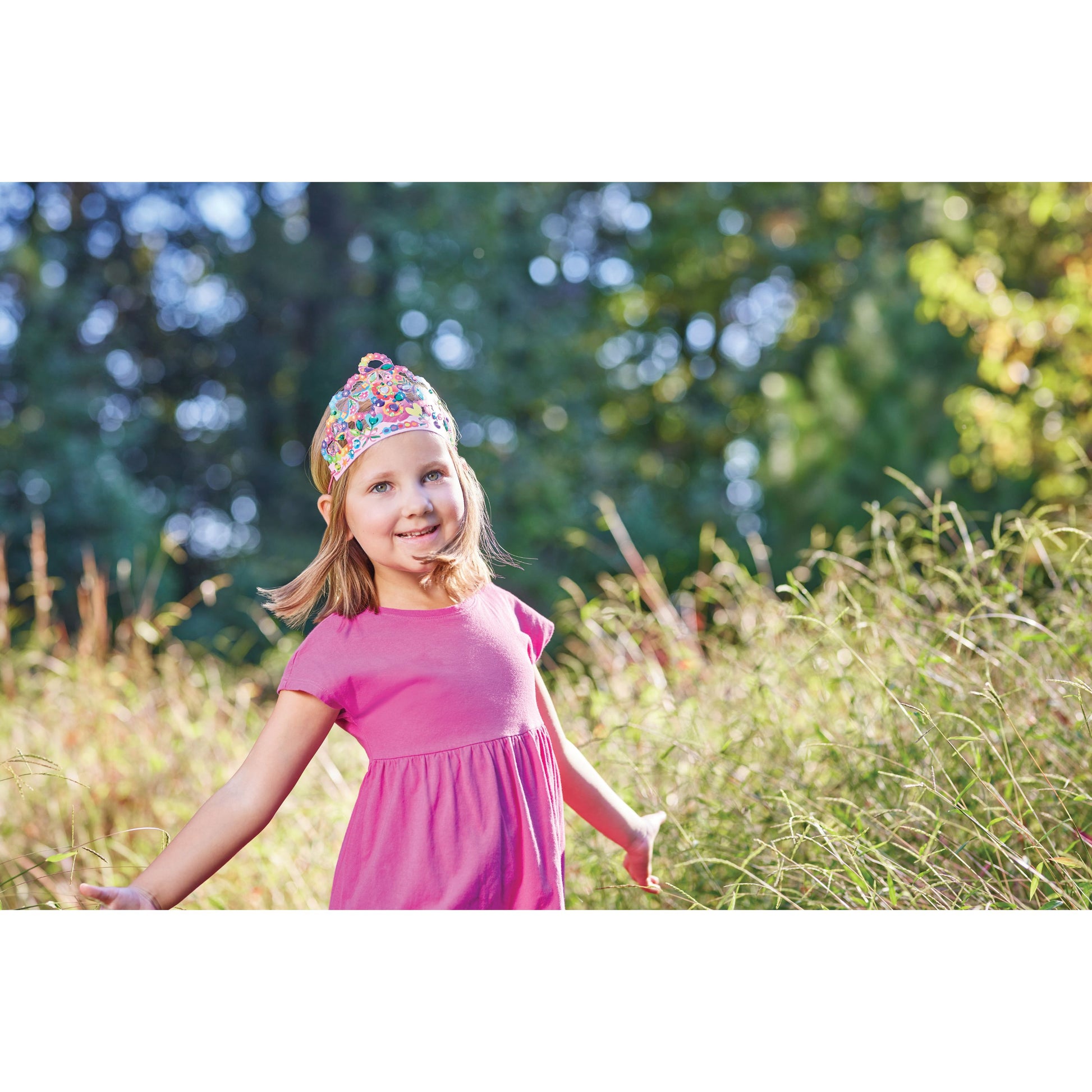 Customize three unique felt crowns with hundreds of mess- free sticky backed gems. Simply peel off the jewels, press them onto your crown, then wear again and again for imaginative play! Each crown is tied with a stretchy elastic band for a comfortable fit.