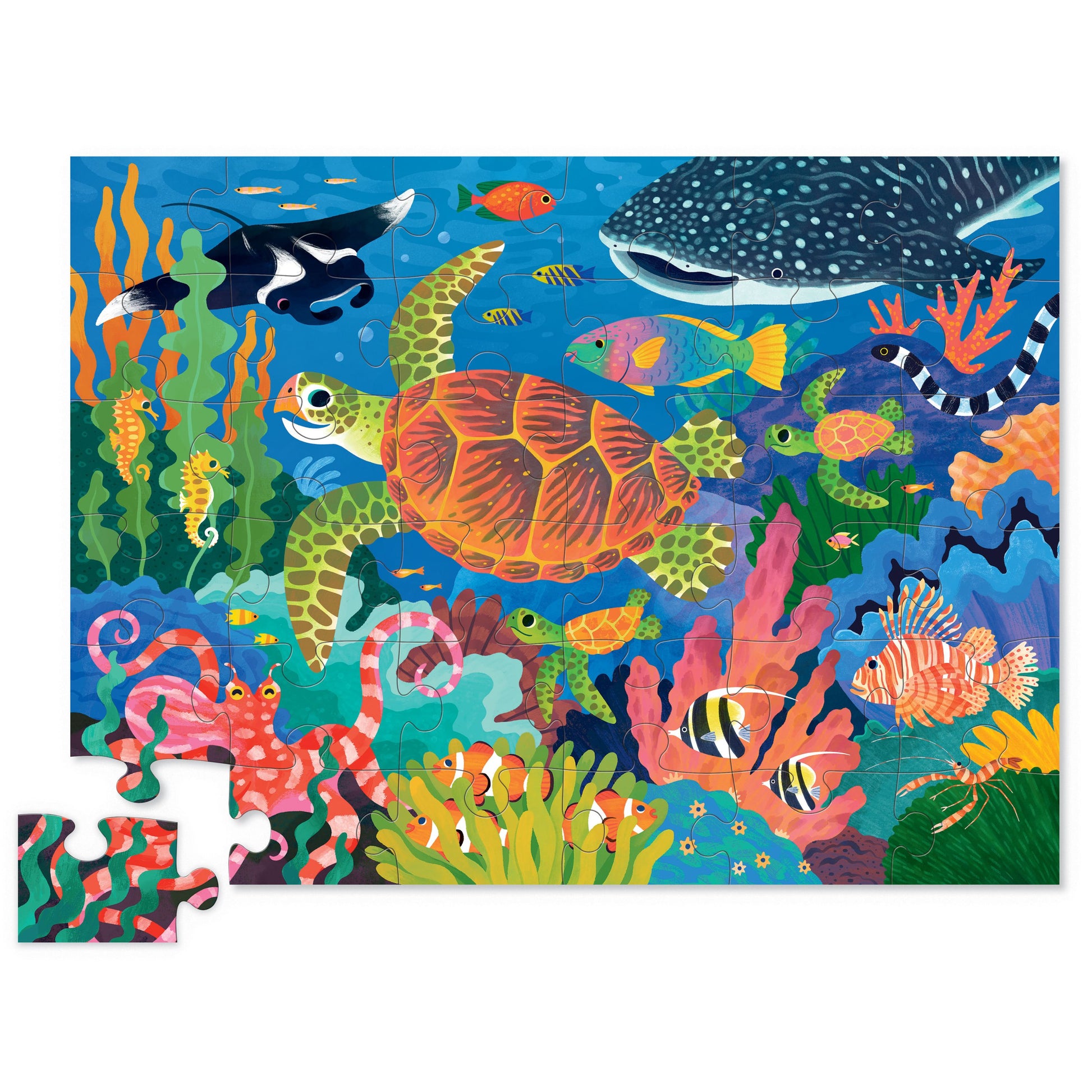 Venture into the deep with this beautifully illustrated ocean themed, foil stamped 36-piece floor puzzle.