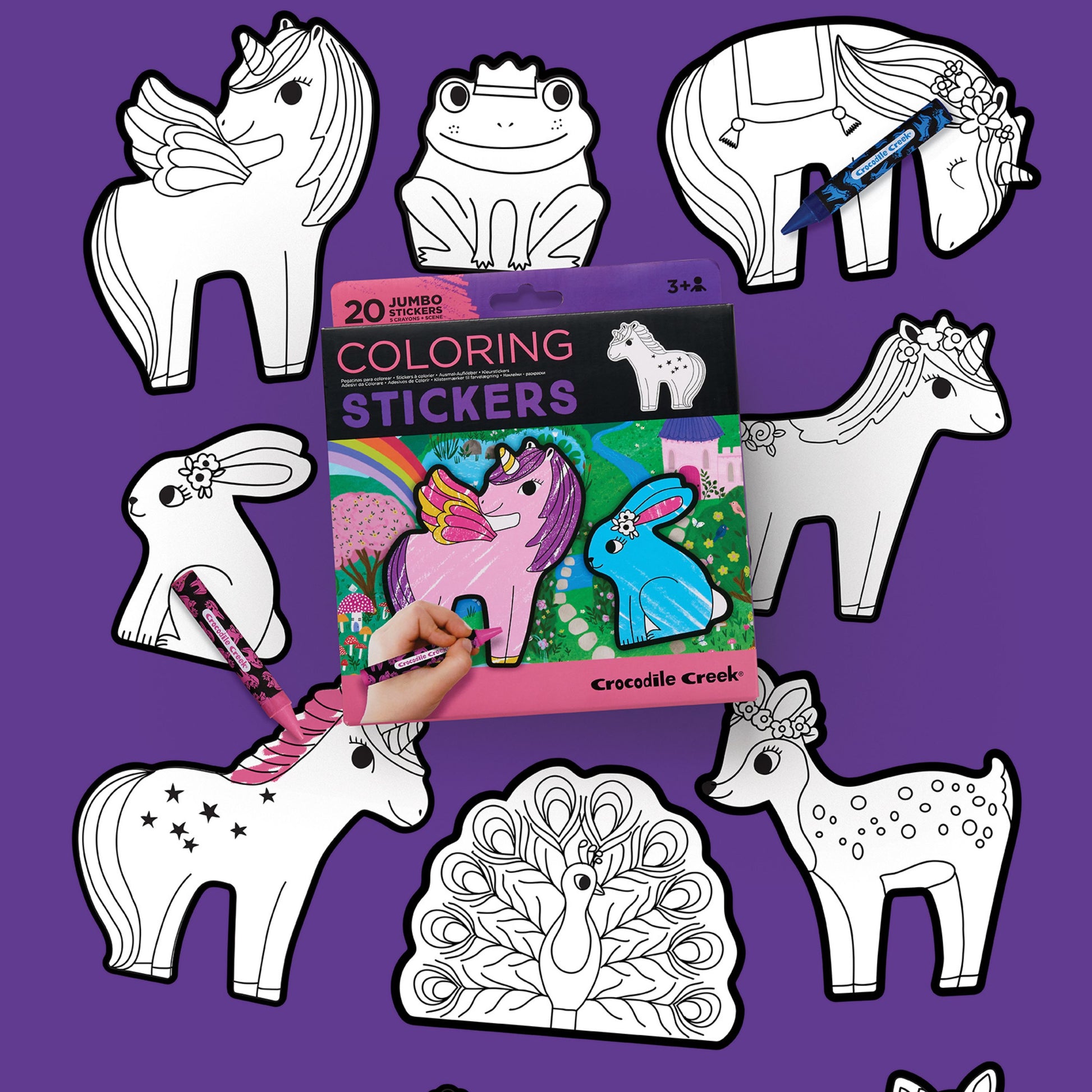 Kids will love these coloring sticker setsthat include 20 jumbo stickers, 5 themed crayons,and a beautifully illustrated scene. 3 available options
