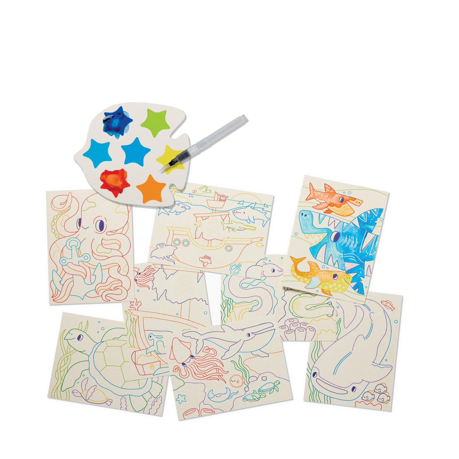FOR THE LITTLE ARTISTS! This wonderful kid-friendly painting set provides an effortless and delightful watercolor painting experience. Hidden details within the Ocean Adventure themed image magically come to life when paint is applied. The Kit includes all the essential elements for hours of artistic fun; 8 water-reveal scenes, 8 mess-free paint palettes, and a convenient water brush pen. For children ages 6 and up