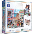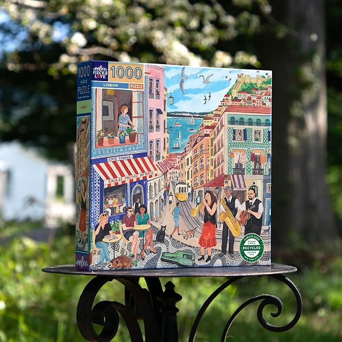 Lisbon, 1000 piece square jigsaw puzzle. This charming addition to our city series features original artwork by Miranda Sofroniou. A snapshot of a well traveled day filled with great food, lively music, tiled facades, and breezy summer afternoons.