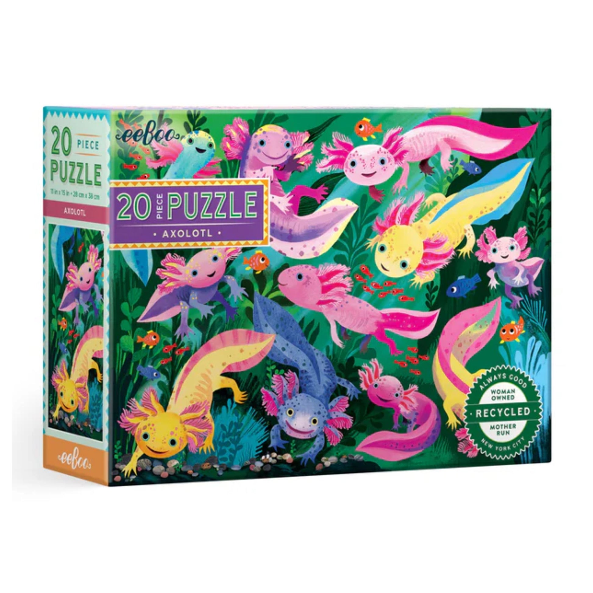 While developing motor skills and spatial reasoning, children can enjoy a fun-filled axolotl scene when this 20 piece puzzle is assembled. Printed on high-quality cardstock composed of 90% recycled greyboard, puzzle measures 11 x 15 inches when complete.