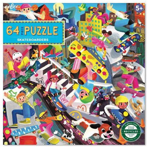 Flip, soar, and be prepared to be impressed by all the tricks on display in this vibrant scene of Skateboarders! In this 64 Piece Puzzle, perfect for ages 5+, there’s so much to marvel at. From the daring stunts to the creative board art, urban architecture and friendly hounds. It’s hard to pick a favorite detail!