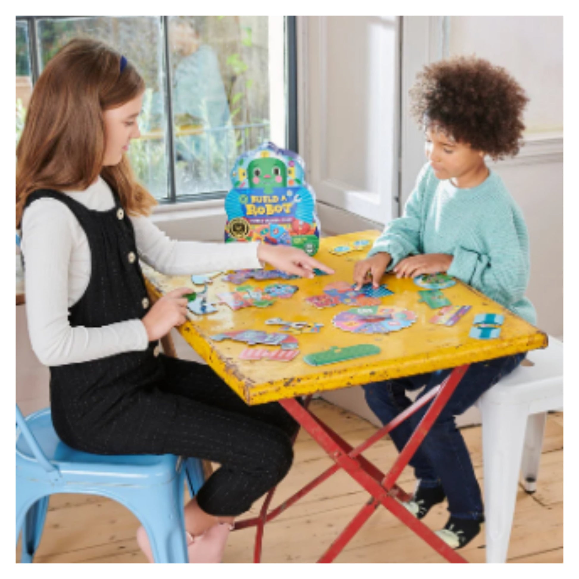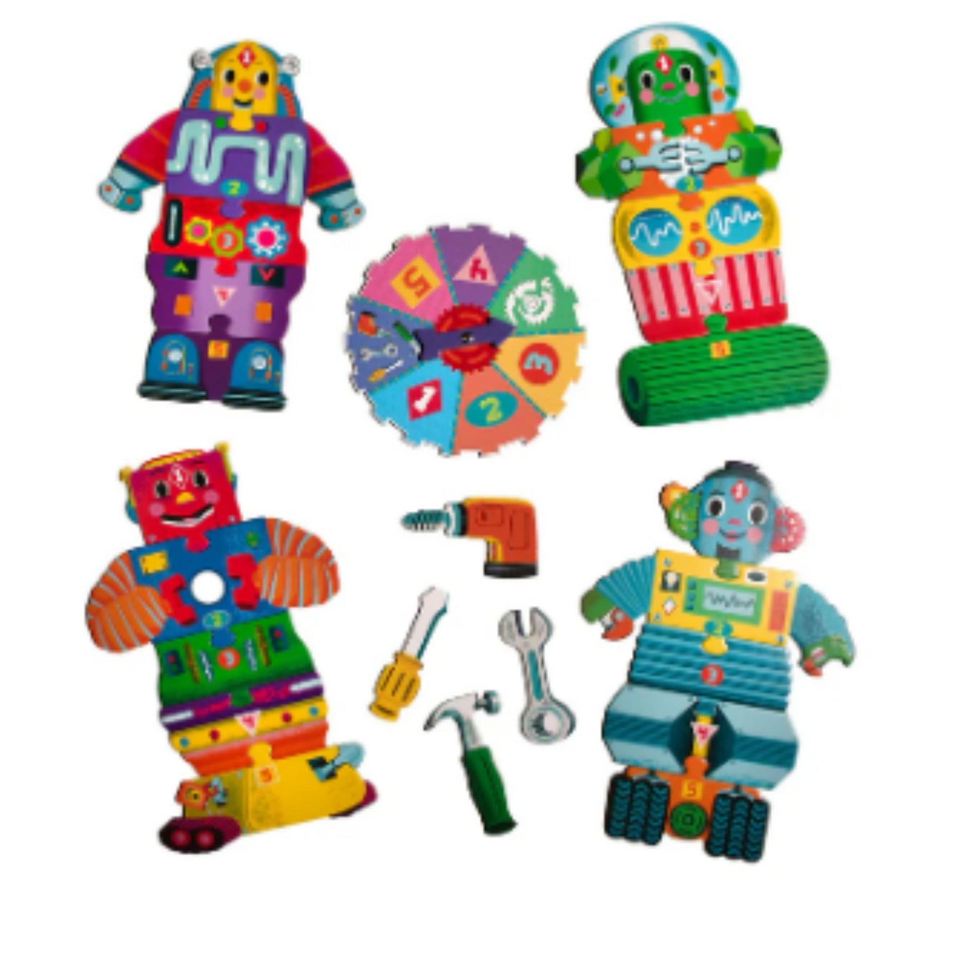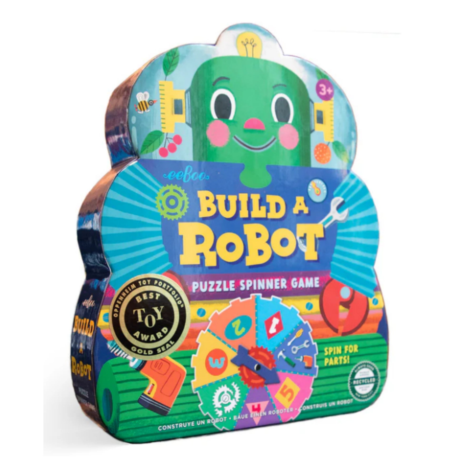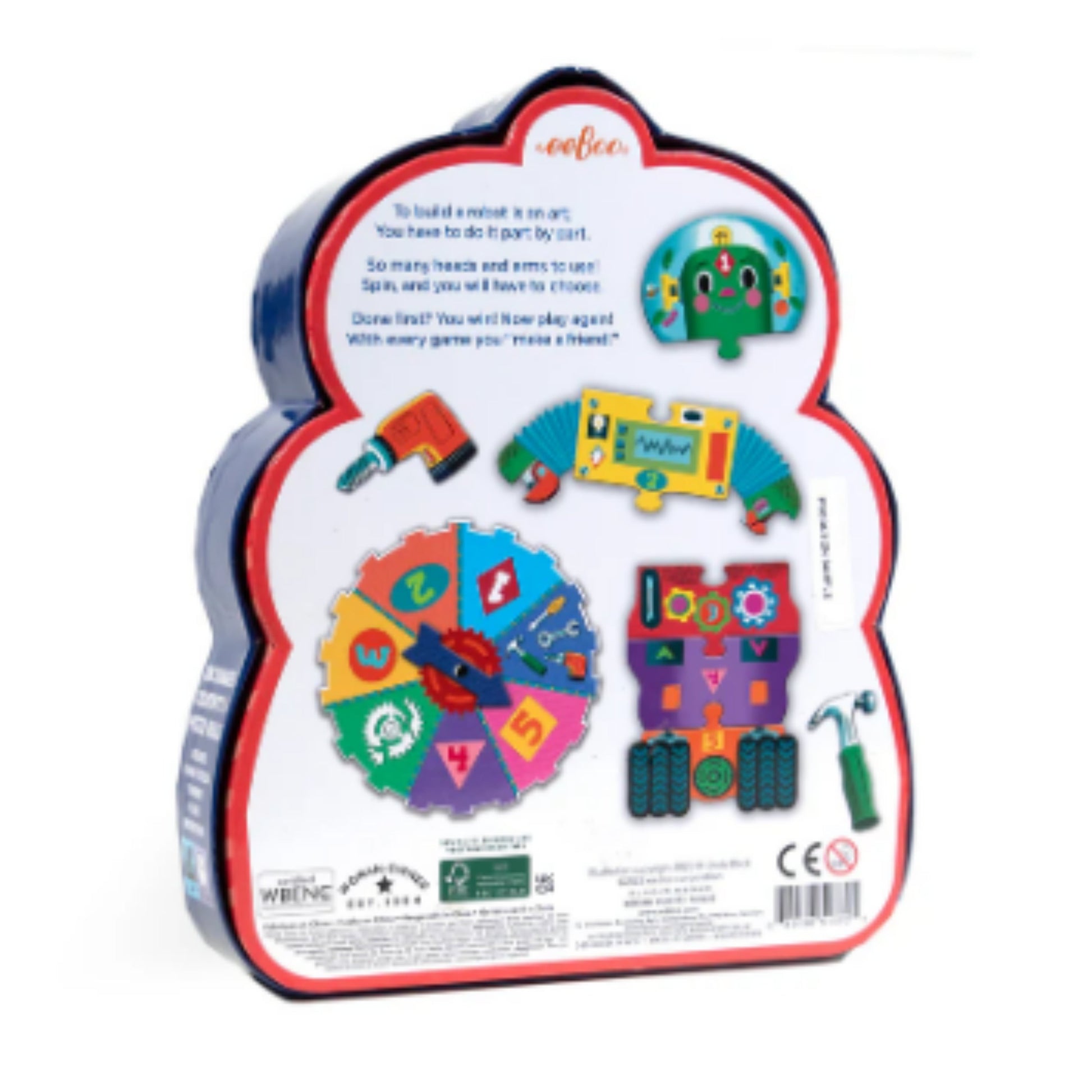 Spin for numbered pieces to build a robot. A pleasing game for young children that includes simple numbers and the satisfaction of choosing and combining parts to create a robot.
