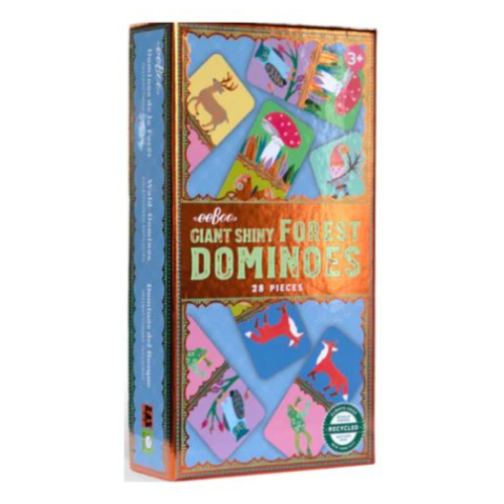 Oversized, sturdy dominoes made with 90% recycled greyboard. Shiny, with an iridescent copper foil to make them sparkle. A simple to learn, classic, old-school game featuring fanciful creatures of the forest. A great game for multi-generational or family play.