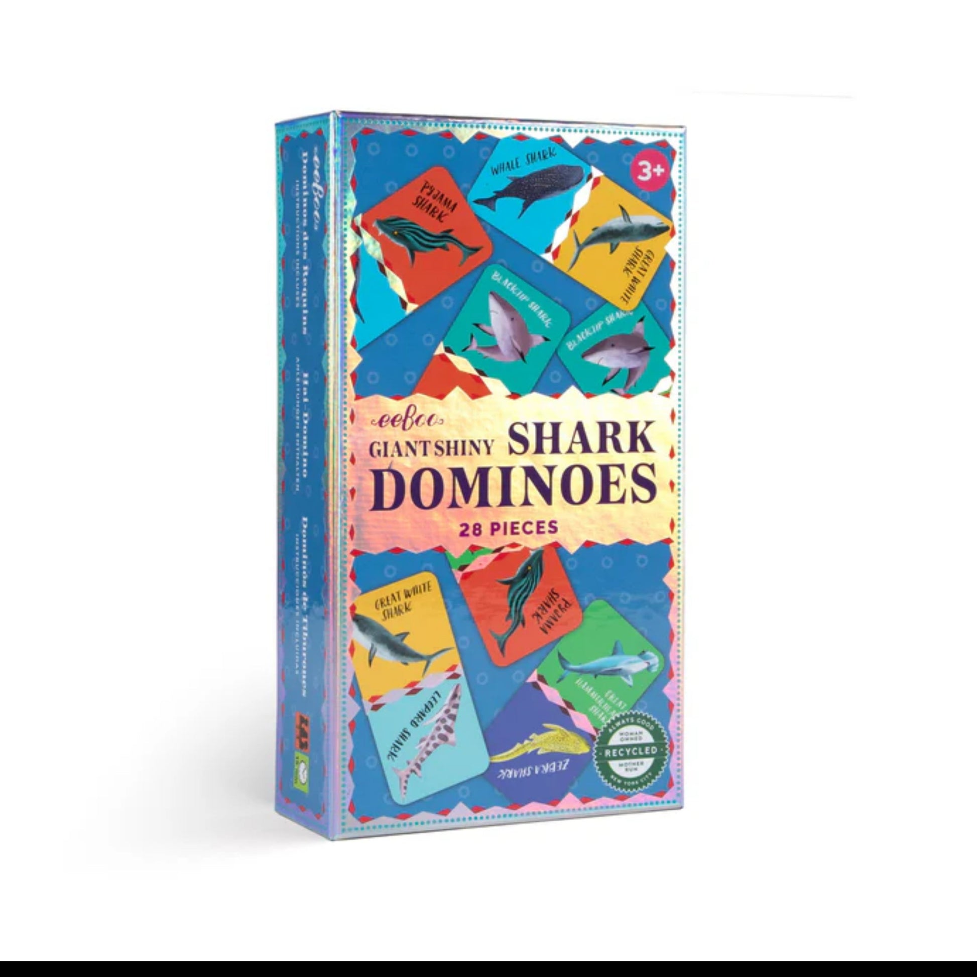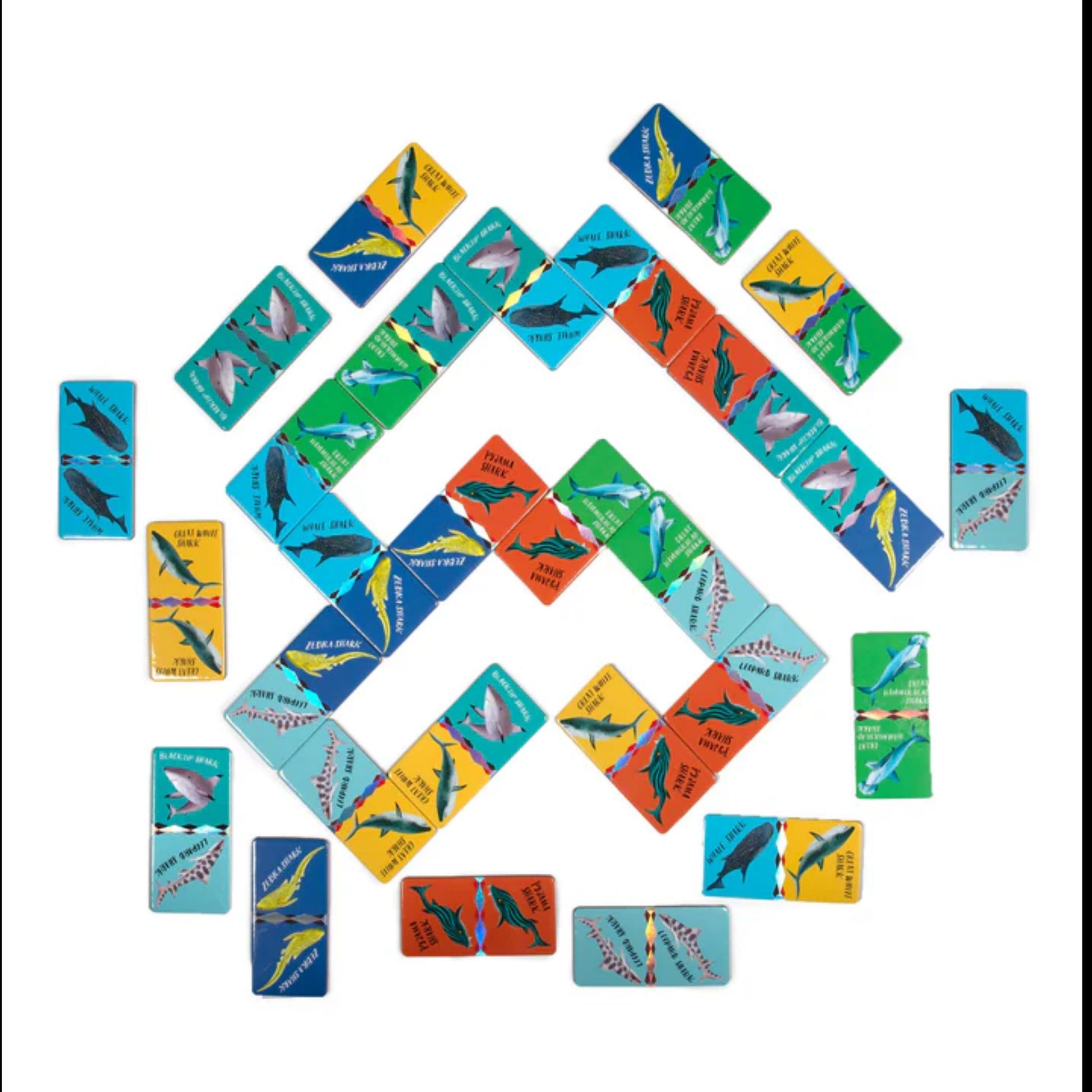 Giant Shiny Shark Dominoes will be sure to intrigue all deep-sea fans. Each die-cut domino piece features two sharks, with their names and shiny foil highlights. The set includes twenty-eight dominos that are 4.5 x 2.25 inches - a perfect size for young players. The classic game of dominoes develops matching skills and is one the whole family can enjoy together.