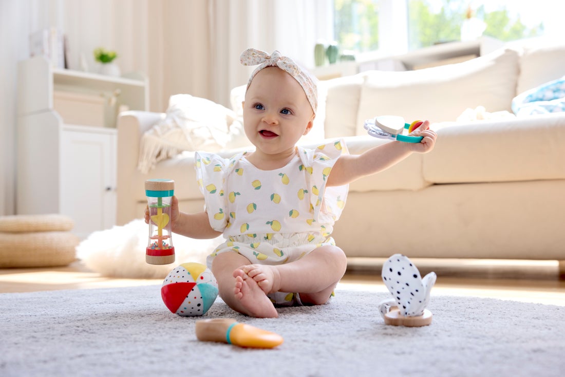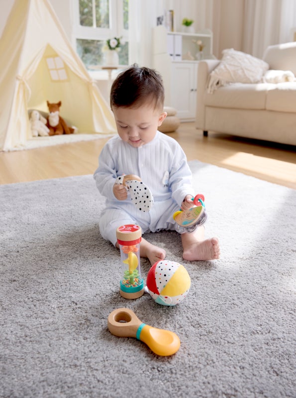 A 5-in-1 toy set with a tambourine, rattle, ball, ring, and rainmaker that helps develop babies core skills.