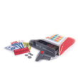 Learn how to manage money with this fantastic cash register! Select your groceries then work out the price! With a solar-powered calculator, a scanner with light and sound effects and coins and notes to keep in the opening drawer.