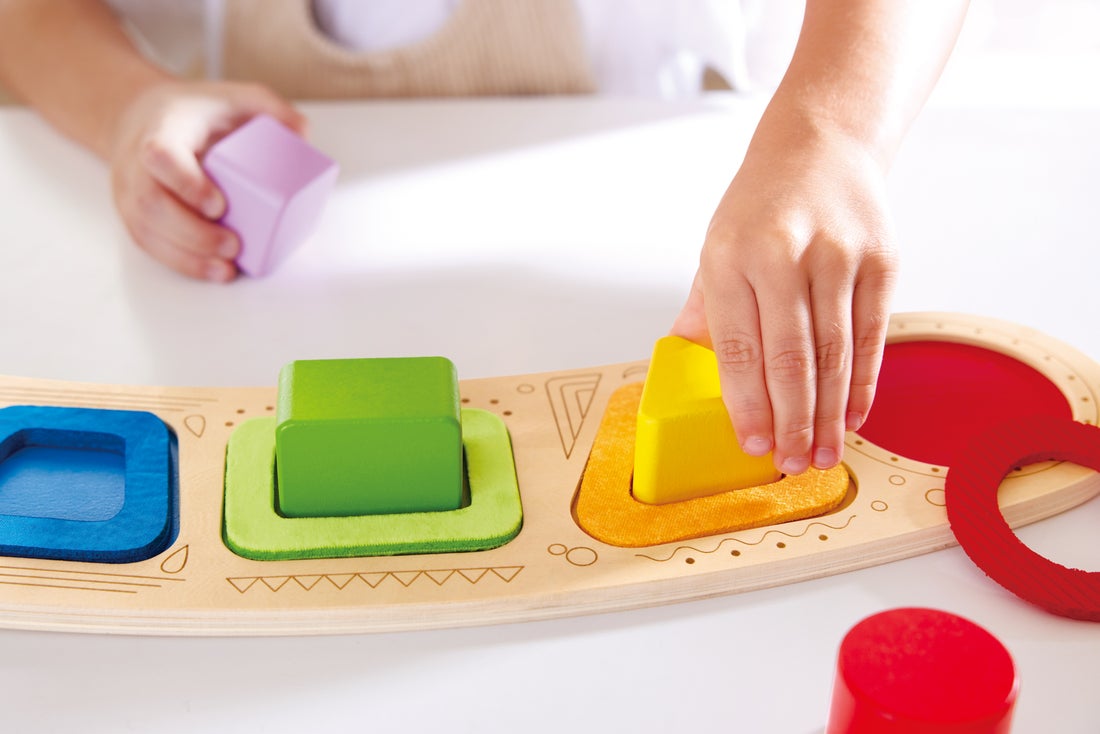 This Montessori-inspired puzzle has colourful shapes and textures to ignite imaginations and growing brains! Start by sorting the colourful blocks, then dive into a shape-matching game that`s as fun as it is smart. The soft, textured pieces add a sensory surprise, encouraging touch and exploration. SAFE & DURABLE: Made with solid wood and finished with non-toxic water-based paint, these blocks are both sturdy and safe for children to play with, ensuring long-lasting fun and exploration.SHAPE MATCHING: This puzzle actively supports children in enhancing their ability to recognise and match shapes, a fundamental skill for logical thinking.IMPROVES COLOUR RECOGNITION: Designed to help children identify and differentiate colours, this puzzle fosters visual perception and cognitive growth.PROMOTES SENSORY DEVELOPMENT: The soft, tactile middle layer puzzles are made from different materials stimulate a child`s senses, aiding in their sensory development.DEVELOPS FINE MOTOR SKILLS: The large, easy-to-grab blocks are designed to help young children improve their fine motor skills and hand-eye coordination.ELEGANT DESIGN: The puzzle base board featuring a curved frame and fun patterns, adds an aesthetic touch, making it a visually appealing toy for children and parents alike.