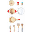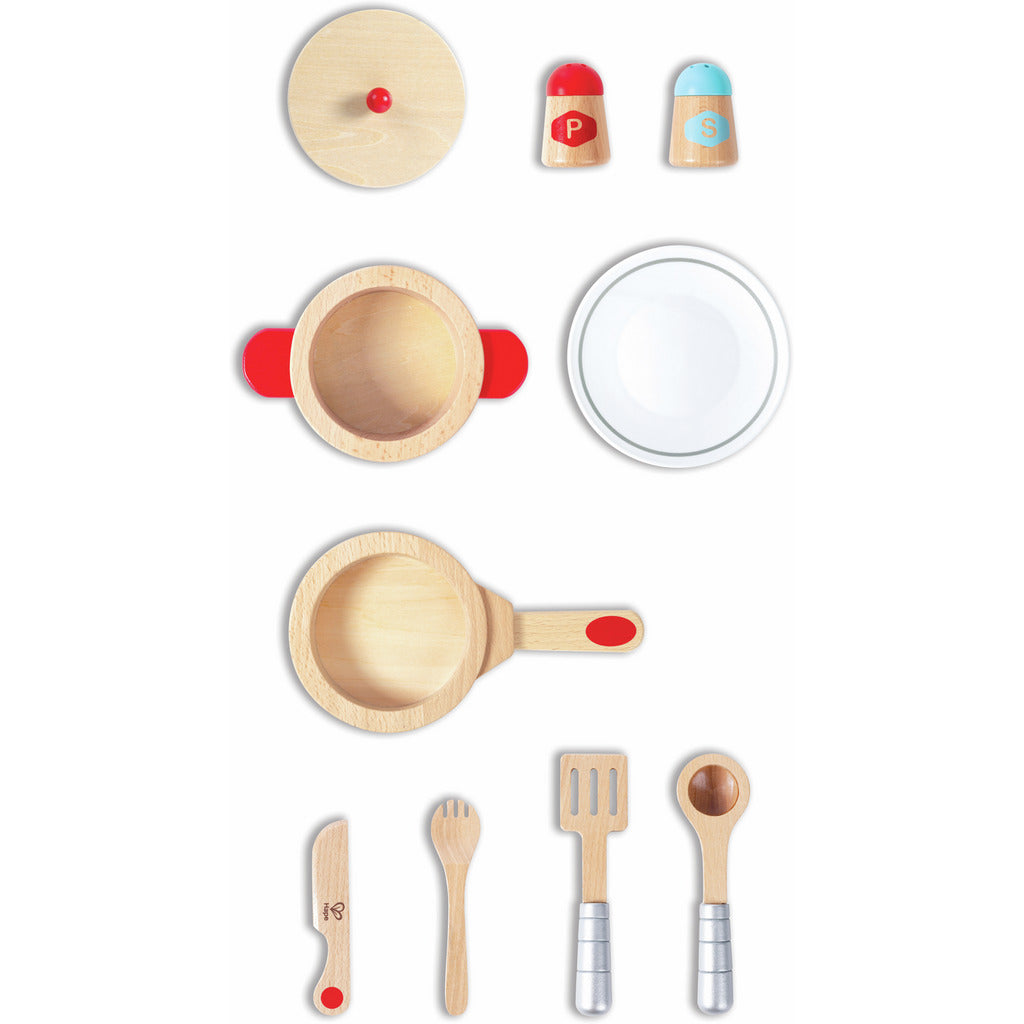 With the Cook & Serve Set’s wooden pot, pan, plates and accessories, your child has everything they need to cook a delicious meal for friends or family!