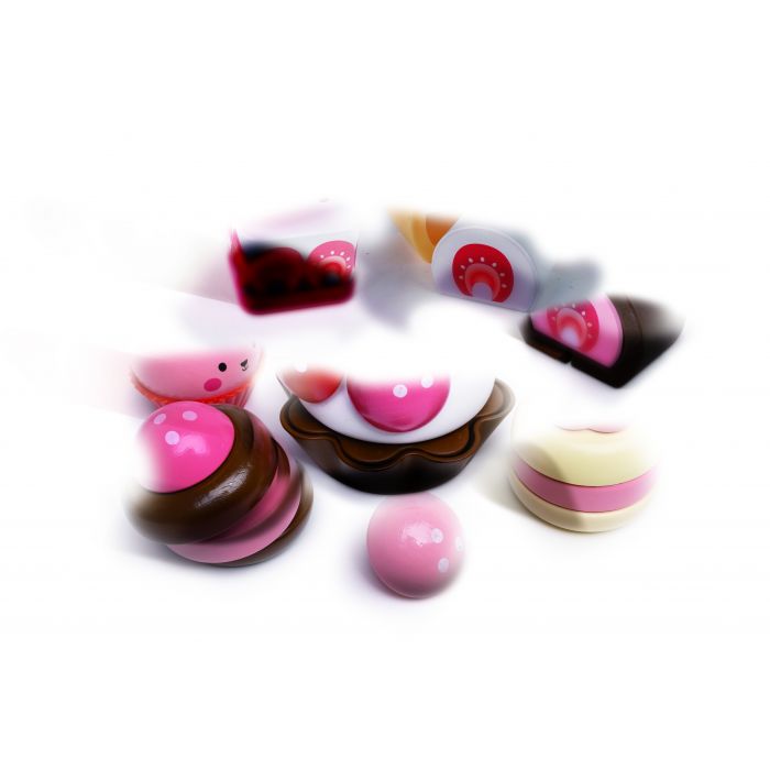 The set contains a cupcake with bunny decoration, two different strawberry sponge rolls, two different strawberry cream cakes and two different strawberry cake slices.