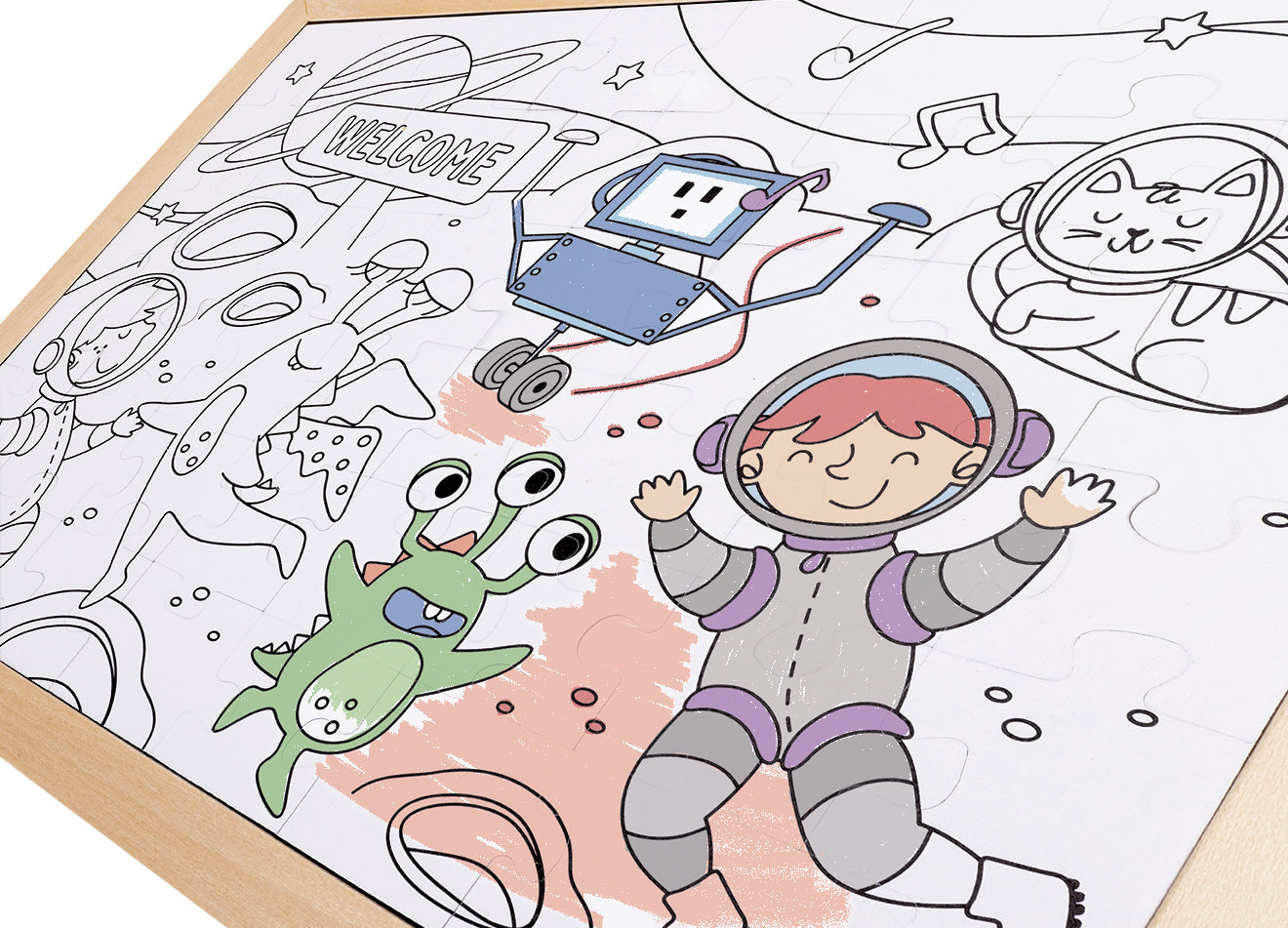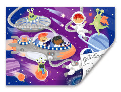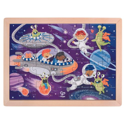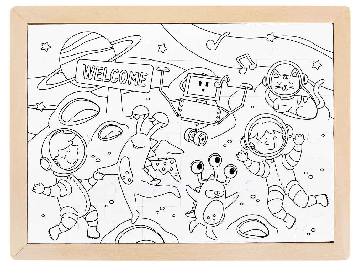 Explore infinite space with this cosmic 48 piece jigsaw puzzle. It features an astronaut crew aboard their spaceship, accompanied by a few friendly aliens and lots of twinkling stars. On the back there is an unpainted template that you can use to create your own puzzle.