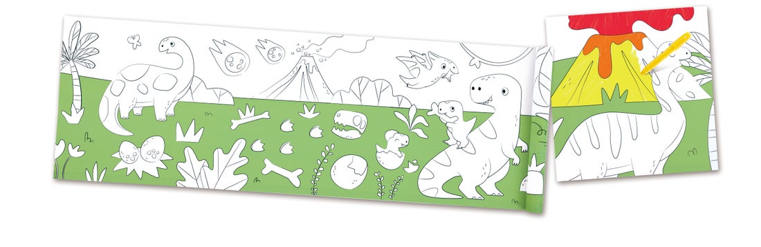 Unleash jurassic artistry with our dinosaur-themed paper roll! Includes 5+ metres of self-adhesive paper and 4 crayons.
