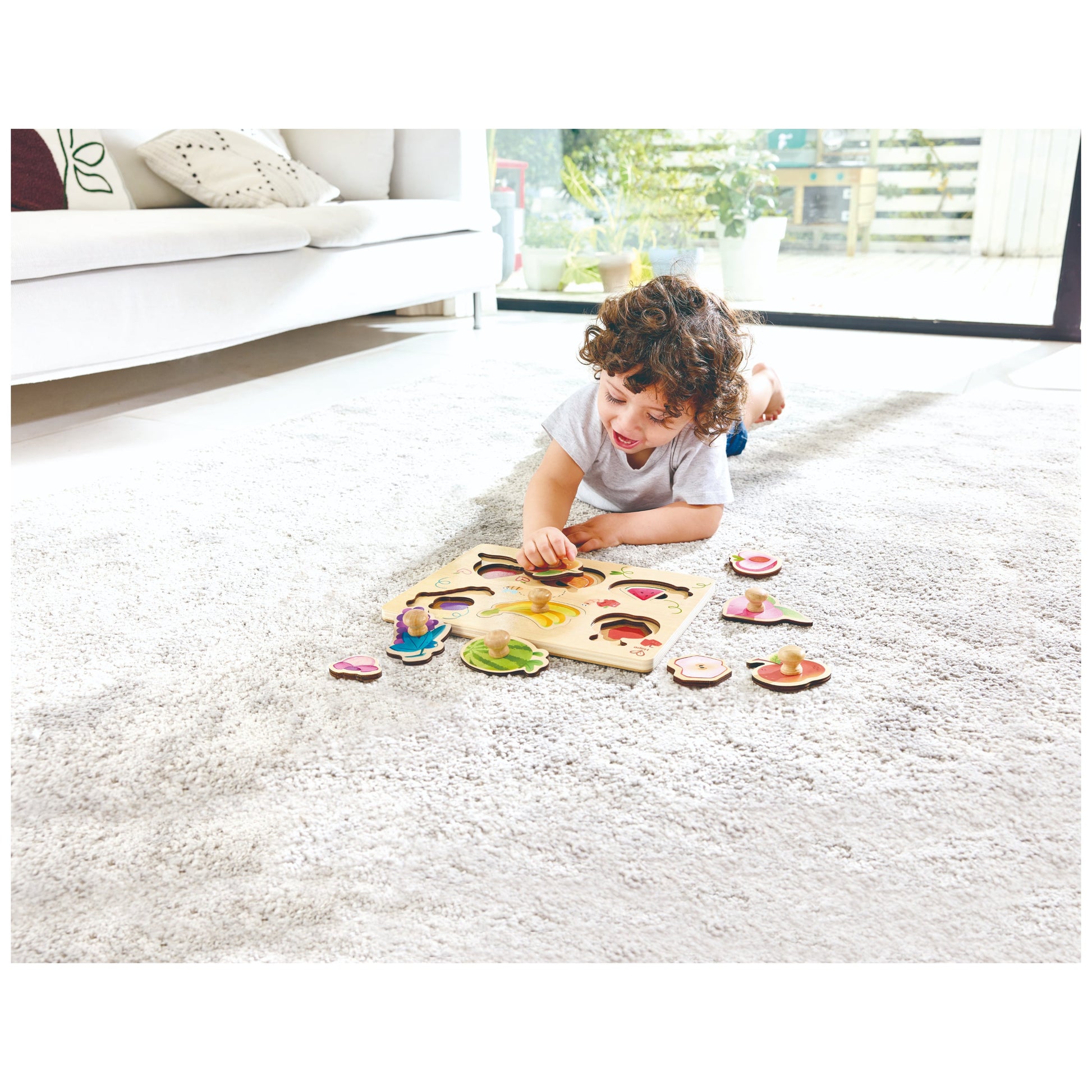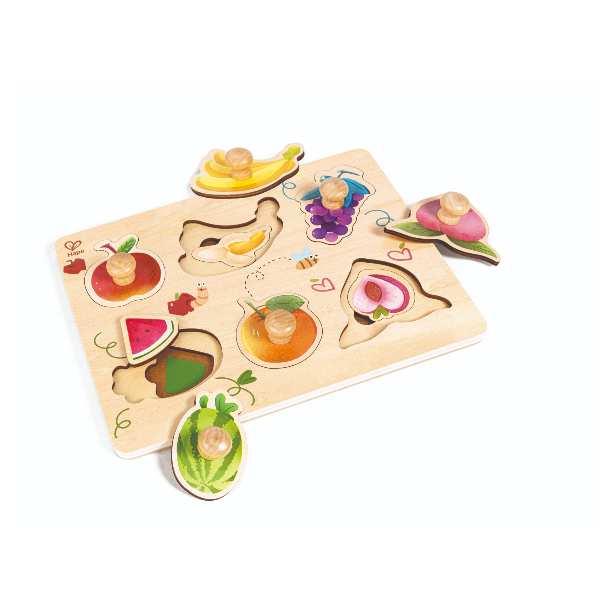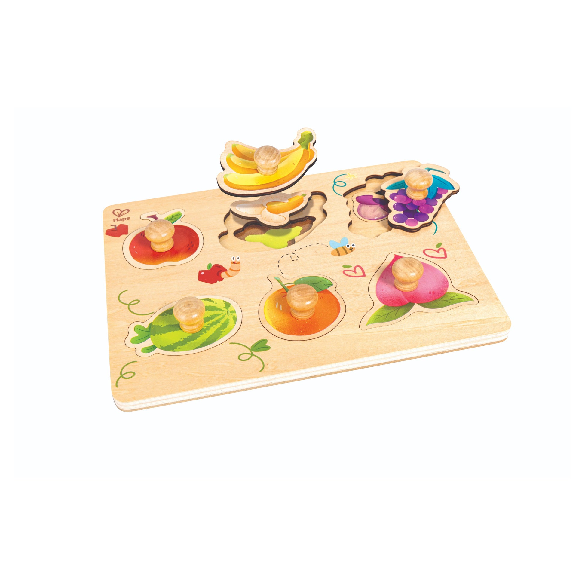 Discover a world of fruit fun and learning with this layered peg puzzle. Engage in a delightful peek-and-reveal game with your child as you gently lift or slide the first layer to uncover the hidden second layer. Use this opportunity to identify and discuss the fruit, encouraging both anticipation and fruit recognition.