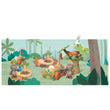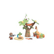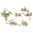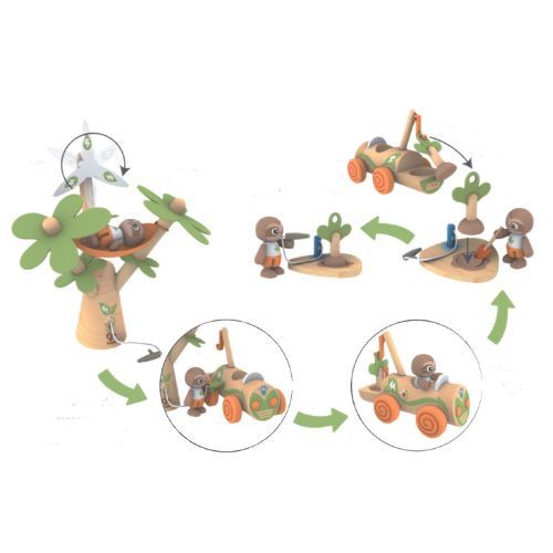 The tall tree has a rotating wind turbine, which powers up a charging device for the car. The baby sloth driver can chill out in a hammock while the battery “re-charges.” The toy e-car has a crane and hook to lift a tiny tree out of the back, and the sloth can use a little digger to make a hole. Plant the tree, then use the water pump to water it!