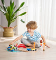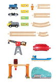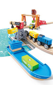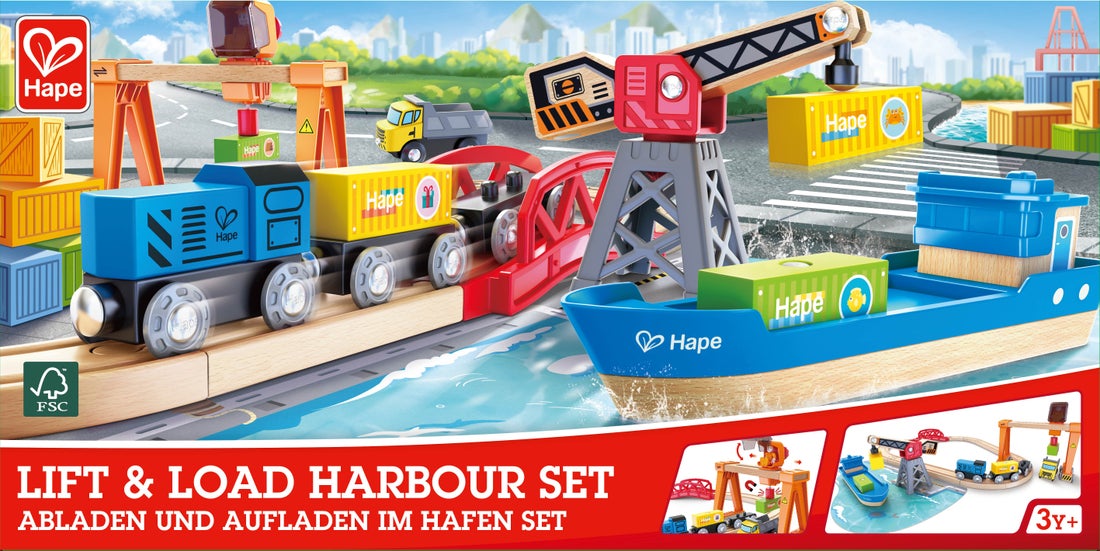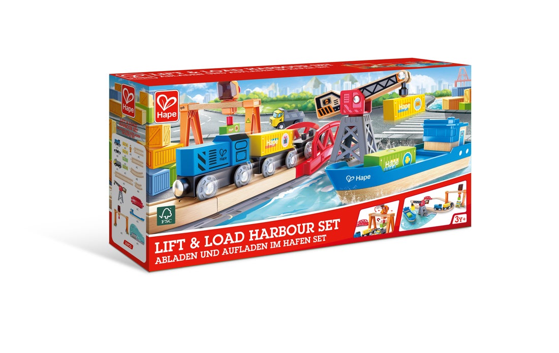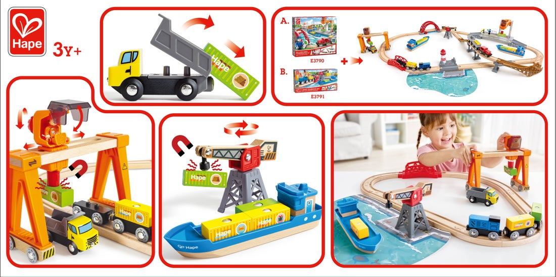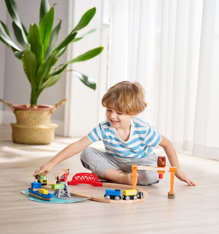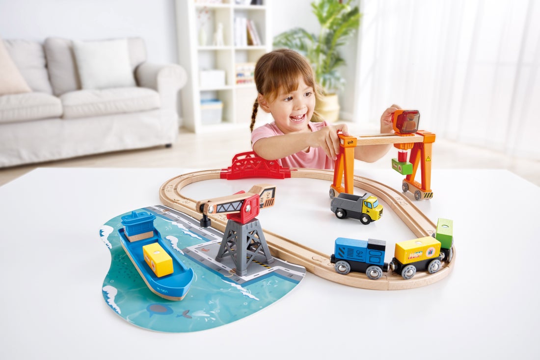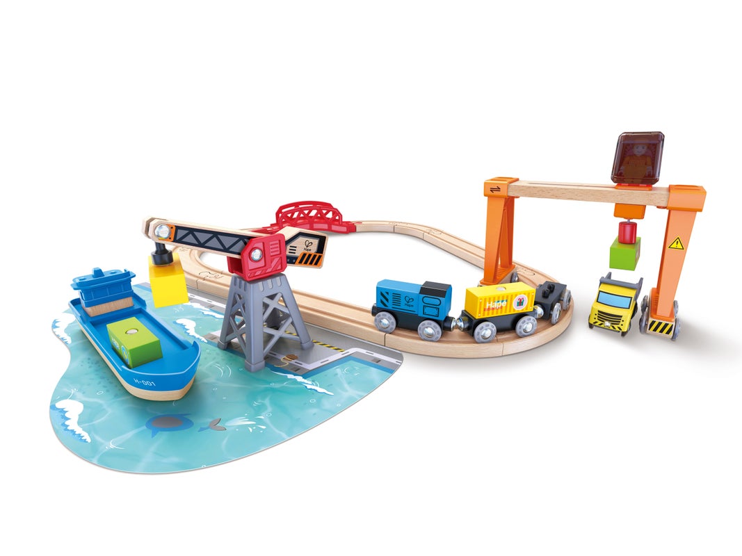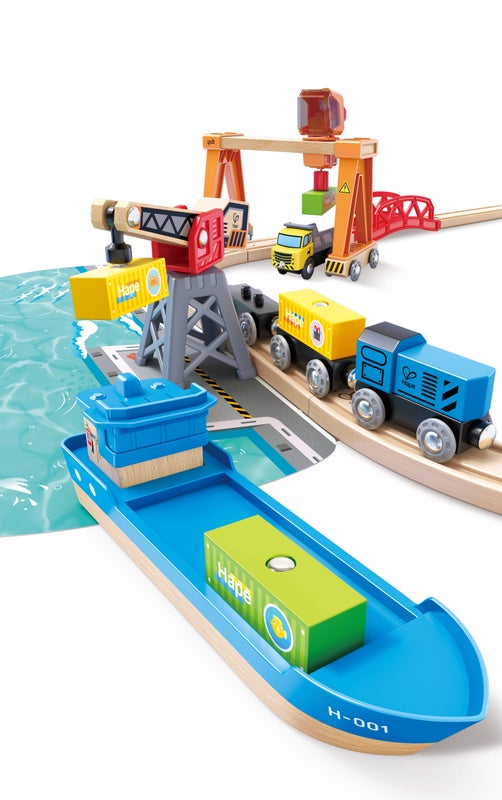 All aboard – by train, truck or ship! This little toy is just like a real integrated cargo operation. Your child will love this realistic cargo ship, working magnetic cranes, train set and truck. Little ones will stack and re-stack the cargo until it’s just right, moving it between modes of transportation. This high-quality wooden toy will teach your child what it takes to move freight all across the globe. The wheels on the bottom of the ship help it move freely across the floor! It’s perfect for active children learning to explore. The set is complete with a gantry crane, a loading crane, eight curved rails, three straight rails, one cargo ship, one locomotive, two trailers, one truck, four cargo blocks, one figurine, one bridge and one ocean cardboard. Because it easily fits with other Hape wooden train sets, your little one can keep going and building until their magical world is fully complete!