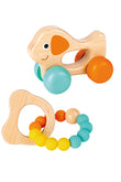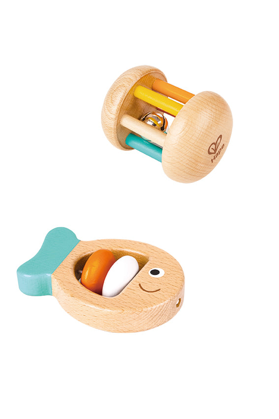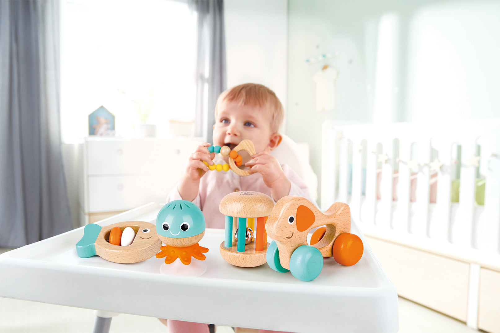 Sensory toys help stimulate all of a baby’s five senses: touch, taste, sight, smell, and hearing. In this set, your little ones get to play with 5 sensory toys such as a fish rattle, a beads teether, a stay-put rattle, a rolling rattle, and a dog on wheels. Each toy has the purpose of helping your child develop their sensory, fine motor skills, and strength.