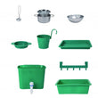 Includes a saucepan, a ladle, two bowls, two flower pots, a colander, a water dispenser, a sink with a faucet and a stovetop.
