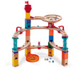 Escape from the castle's rotary tower with this exciting Quadrilla set featuring two transparent stairways. As the marbles make their way down the rail they sound three hanging bells.