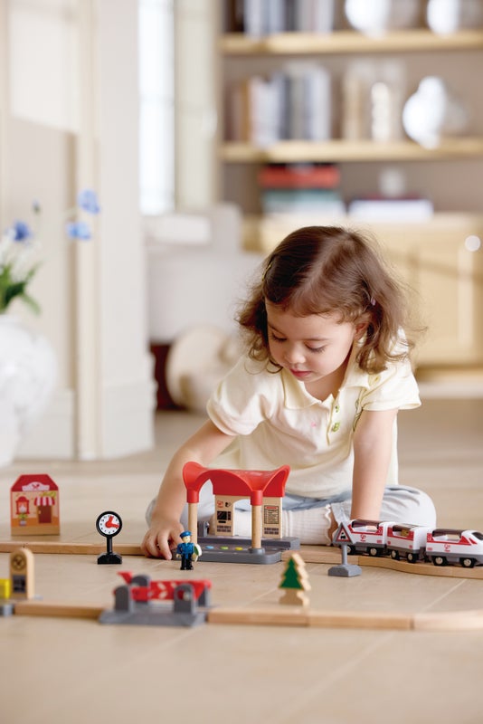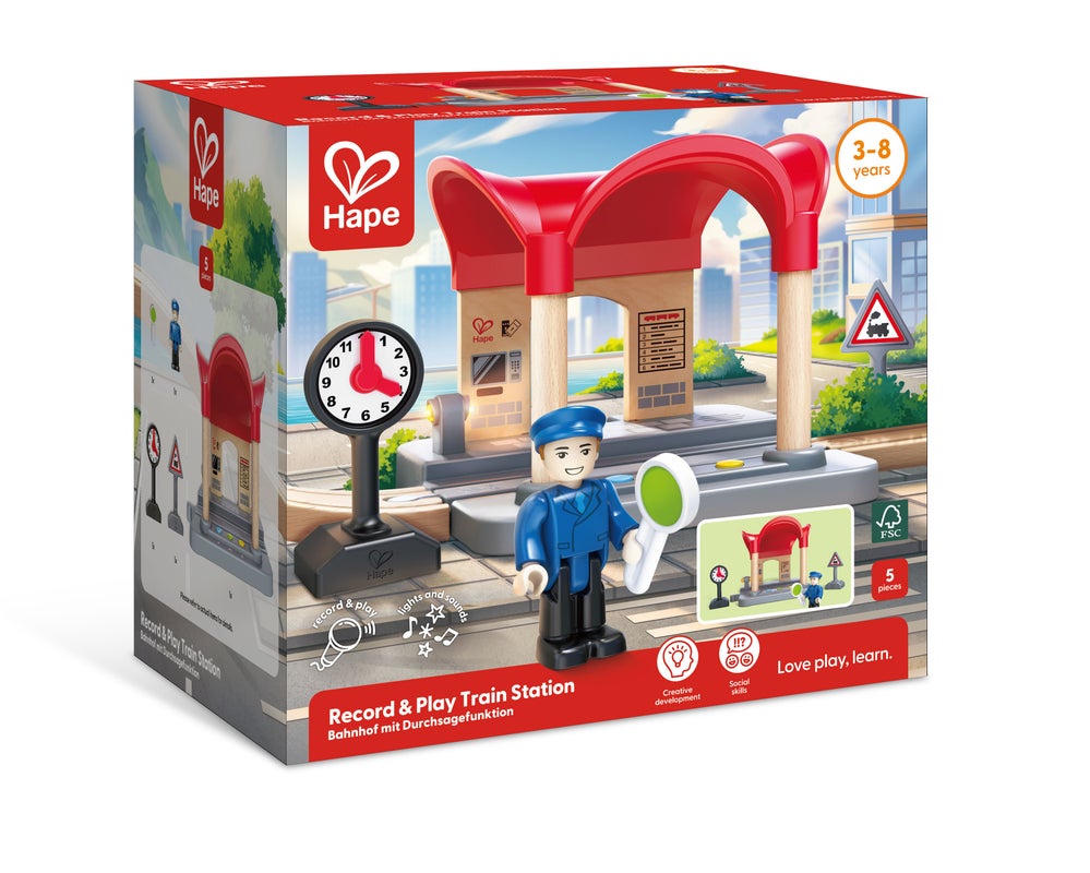 Begin by teaching your child to record their own station announcements. Then, let them press the Play-back Button to hear their voices echo through the station, sparking joy and creativity. Use the Light & Sound Button to introduce the concept of train signals, adding a touch of realism to their play. ULTIMATE INTERACTIVE STATION: This railway toy features an interactive station that springs to life with automatic sound effects as a train passes by, immersing children in a realistic train station atmosphere.nnCUSTOMISABLE SOUNDS: Equipped with a Recording Button, children can create their own personalised station announcements and play them back, adding a unique, interactive element to their playtime. LIGHT & SOUND SIGNAL BUTTON: Press the Light button to trigger a flashing yellow light and a ding sound, signalling the trains arrival with engaging visual and auditory effects that enhance realism. UNLIMITED COMPATIBILITY: Designed to be compatible with Hapes other railway tracks, this set can be easily integrated and expanded, allowing limitless growth and exploration opportunities.