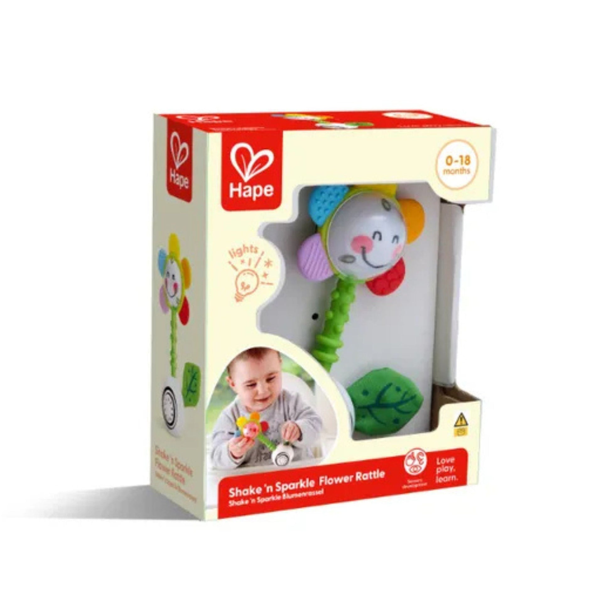 Brighten up playtime with the Hape Shake 'N Sparkle Flower Rattle! This delightful rattle features a charming flower design filled with colorful beads that create a gentle, soothing sound when shaken. The transparent petals allow little ones to watch the beads move, engaging their visual and auditory senses. With an easy-to-grasp handle and smooth, baby-safe materials, this rattle is perfect for little hands. It encourages sensory exploration, hand-eye coordination, and early motor skill development. MULTICOLOURED LIGHTS: The flower head lights up in vibrant colours with every shake and tap.