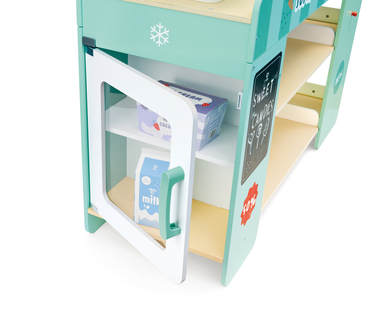 Cashier, stock, and serve customers – this great wooden set offers everything for realistic supermarket role-play!