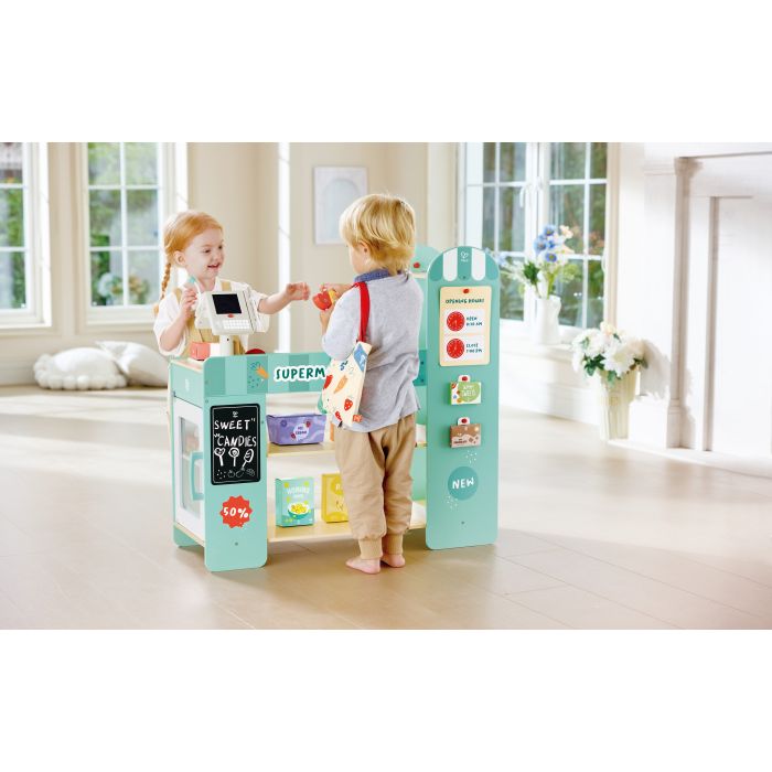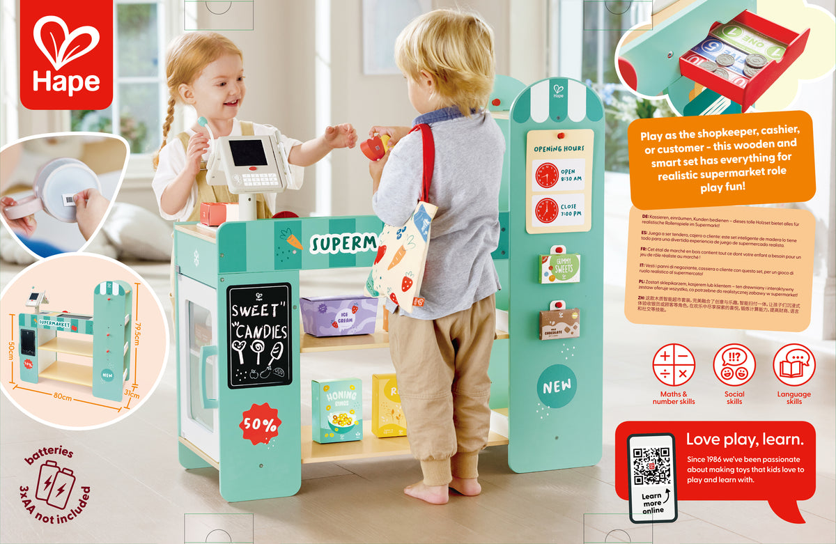Experience endless shopping fun together with our wooden supermarket! You can role-play as a shopkeeper, make sales as a cashier, or shop as a customer in a fully stocked supermarket. Fill the shopping bag with the most amazing treats and take it home – a perfect way to stimulate imagination and creativity. SHOP