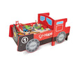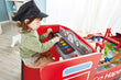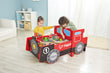Sit at the train control board and press the buttons to hear fun train sounds - First press the red button on the right (ON/OFF - there will be no sound), the green button will make an alarm sound, the yellow button will light up, the blue button will make a clattering sound and the red button on the left will make a braking sound The lever and ignition switch make fun clicking sounds The railway set in the bed of the truck includes one push-along engine, two carriages, 10 small curved rails, two Y-shaped rails, two straight rails, one bridge, four piers, two plastic ascent rails, one crane, one cargo block, one passenger station and two trees The railway set clears away neatly into the bottom of the big train when you're finished