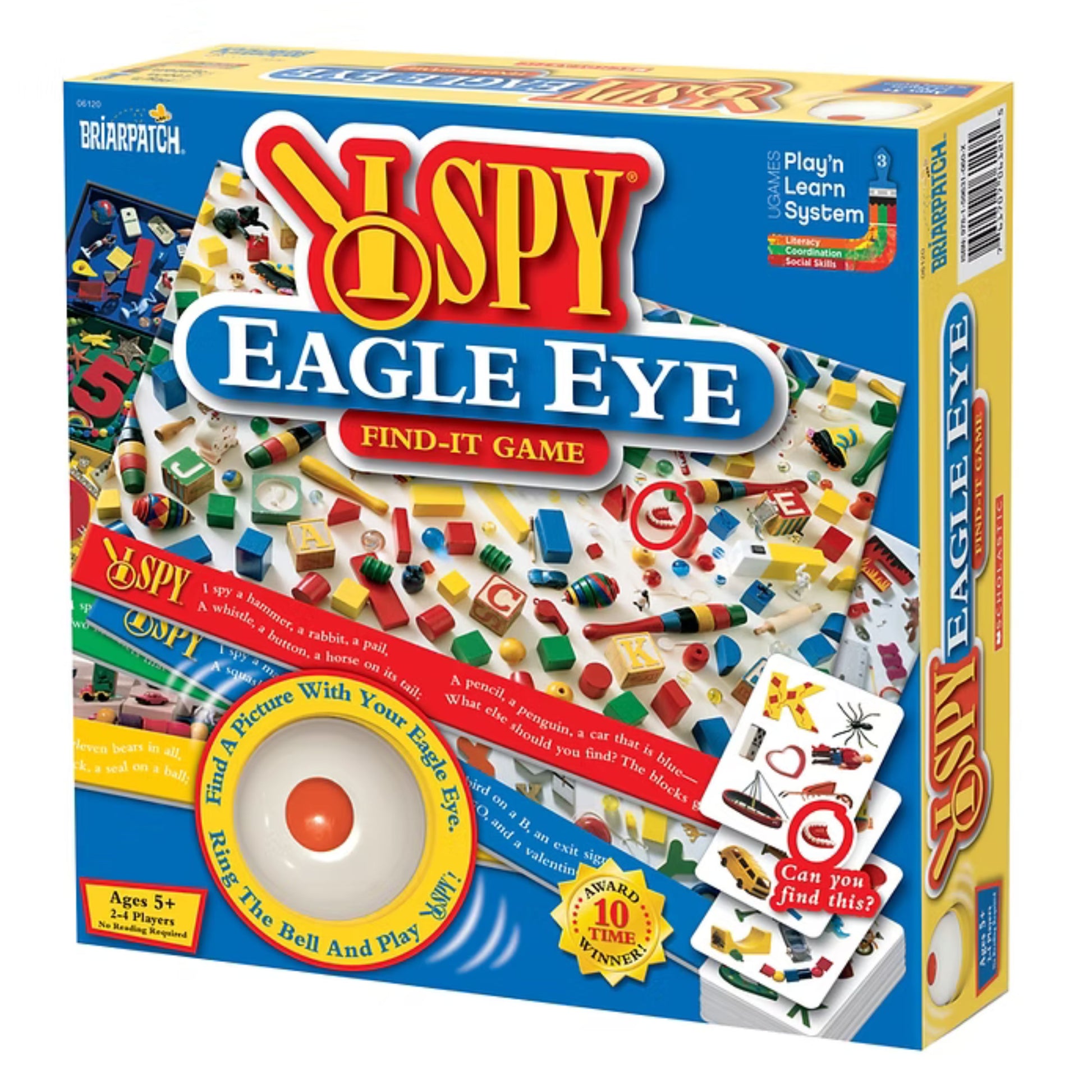 Award winning I SPY Eagle Eye is a great family game. Use your Eagle Eye to spy the object on your game board that matches the object on your card. Look hard, each card and board has only one matching item. Could it be the green race car, or the red ball? Once you find it, be the first to ring the bell, and you win that round! Whoever spots the most objects wins the game.