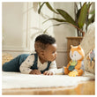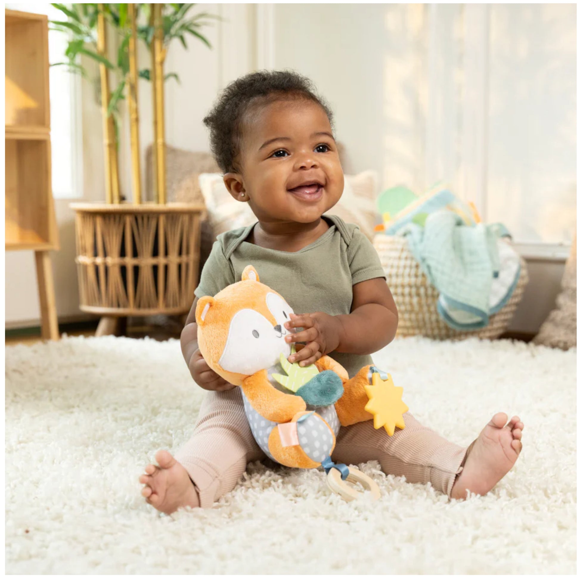 Besides soothing and engaging baby, the Kitt the fox activity toy has a soft fabric loop for parents to easily attach to links for on the go playtime