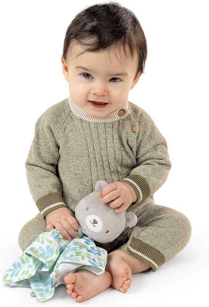 Give baby a gentle kiss of comfort and snuggles alongside the ity by Ingenuity Cozy Lovey - Nate! Crafted with plush fabrics, this soft lovey will keep baby soothed. Not only is this lovey soft to hold in baby's small hands, but it's appealing to look at with its bold leaf pattern topped with the ultra-cute Nate the bear. You can keep baby comforted at home or while conquering your to-do list on the go. This compact lovey can be easily carried in a diaper bag or purse and also fits into baby's little hands to hold and explore?. Nate will become that comforting family member baby will recognize and associate with security. This gender-neutral lovey is perfect for age newborn and up. Nate is part of a collection of fun ity by Ingenuity characters and pairs well with fellow lovey creature Deni the raccoon.
