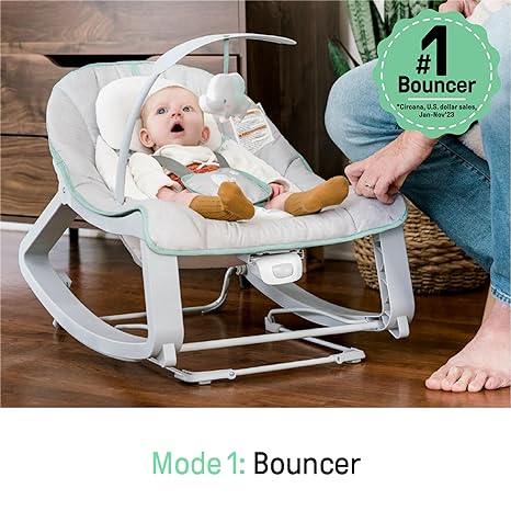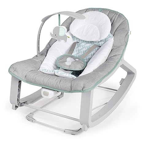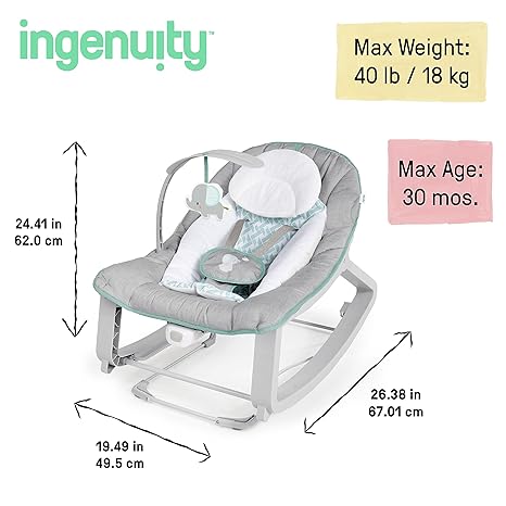 he Ingenuity Keep Cozy 3-in-1 Grow with Me Bounce & Rock Seat grows with baby and is designed to be enjoyed for years. Choose between bouncing, rocking, or a stationary seat. Soothing vibrations, two reclining positions, and a removable infant bolster help newborns feel snug and secure. As your child grows, the infant seat will become their favorite comfy spot in the house. The Keep Cozy™ includes a detachable hanging toy to provide playtime entertainment while at home or on the go. Its soft, neutral design blends right into your home, so you can feel comfortable leaving it out for anyone to see. Accommodates infants and toddlers up to 40 pounds.