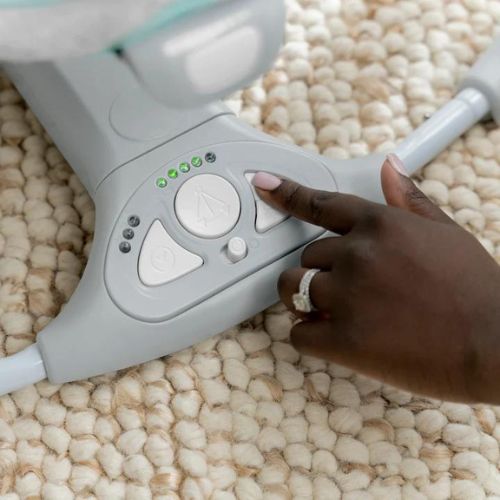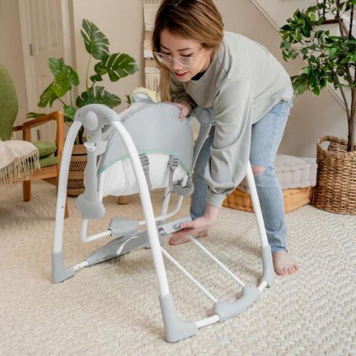 ife isn’t lived in one place. When you have places to go, the ConvertMe Swing-2-Seat Portable Swing is along for the ride. The compact frame is easy to transport, with all the same features you’d expect from a full-sized swing. Your baby can rest easy while enjoying automatic swinging motions, listening to soothing nature sounds and melodies, and reaching for the plush hanging toys. Designed by Ingenuity to fit anywhere, you can use the USB cord that is included to save money on batteries. Wall adapter NOT included. You don’t have to sacrifice function with this mini swing. The 5-point harness and non-slip feet ensure your baby’s safety, and comfort is in full swing with the ultra soft seat pad. The swing grows with your baby thanks to weight-sensing technology, and the extra head support can be removed when baby outgrows it. Your baby’s happy place can be any place with this on-the-go swing.