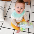 The soft book features multiple textures to keep baby engaged, such as the crinkle (hidden inside) and 3 satin ribbon tags. The tags encourage self-soothing and comfort