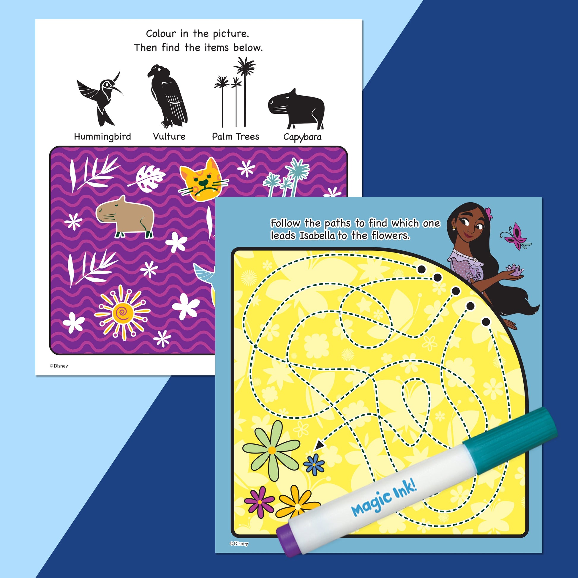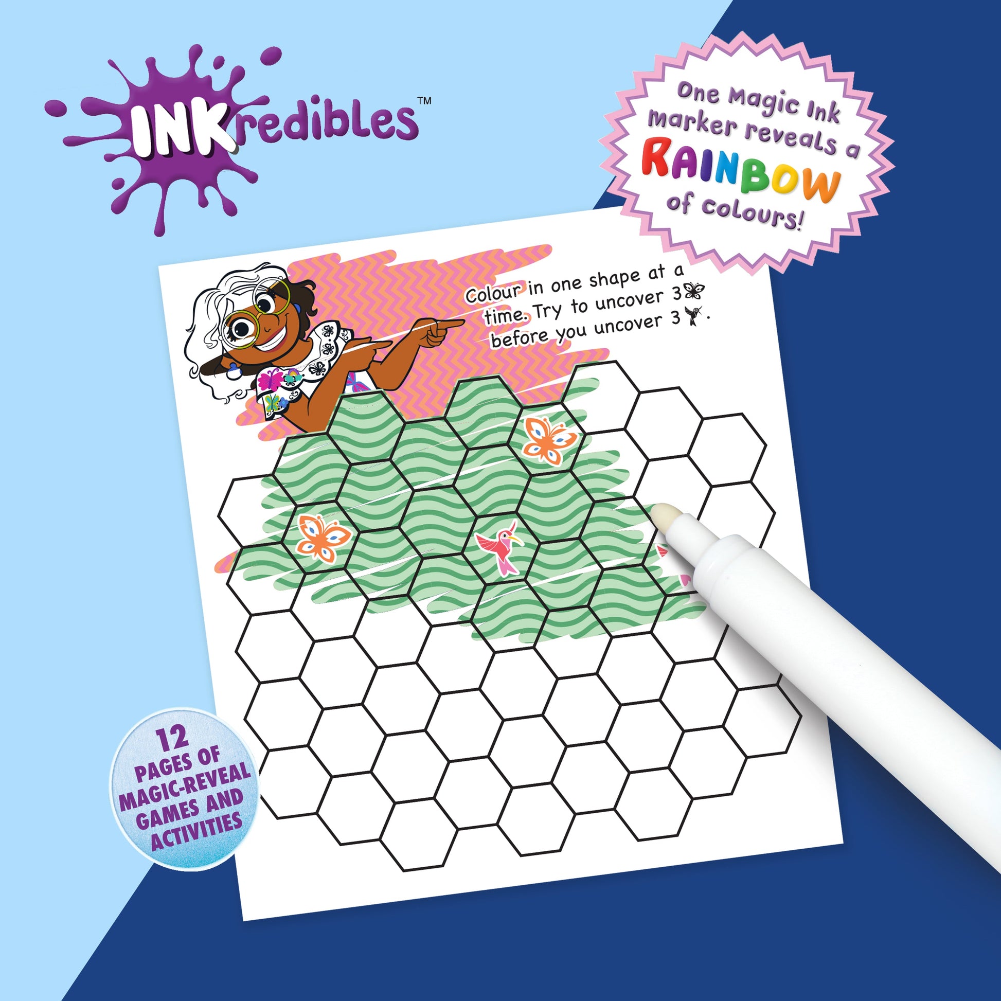 Reveal a rainbow of colours on every page with Disney Encanto Inkredibles Magic Ink! This patented technology magically reveals a rainbow of colours with just one Magic Ink marker. Your little artist will love finding Mirabel and her family through the magic of mess-free colouring!