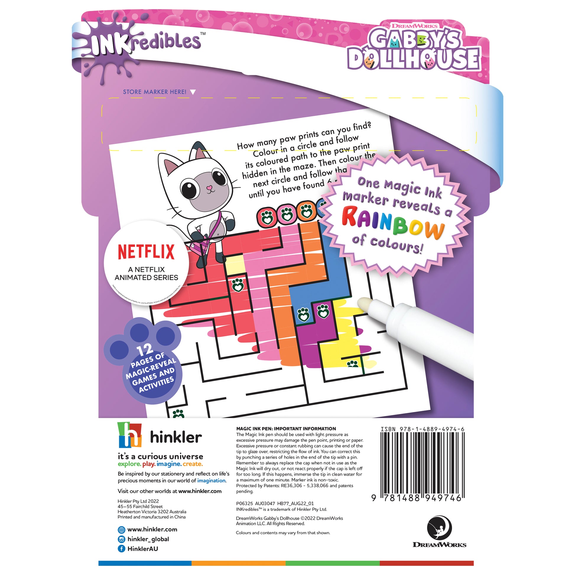 Reveal a rainbow of colours on every page with Gabby’s Dollhouse Inkredibles magic pictures! This patented technology magically reveals a rainbow of colours with just one Magic Ink marker. Your little artist will love finding Gabby, Mercat, Pandy, Cakey and DJ Catnip, and you will love the magic of mess-free colouring!