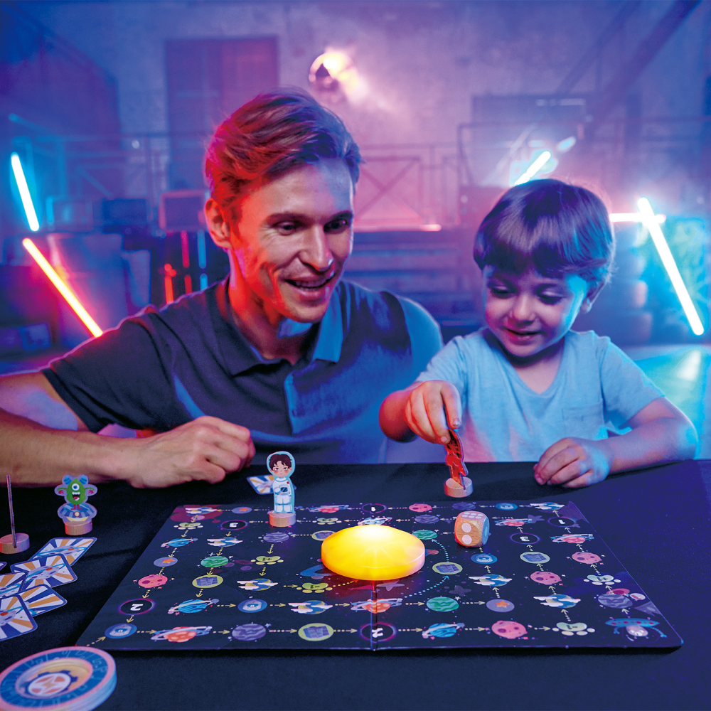 • PLENTY OF PIECES: This game includes a game board, Space figurines, action cards and even an LED Sun.