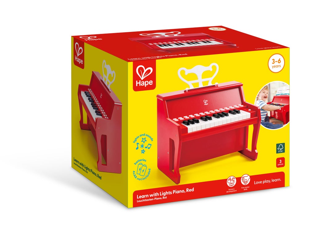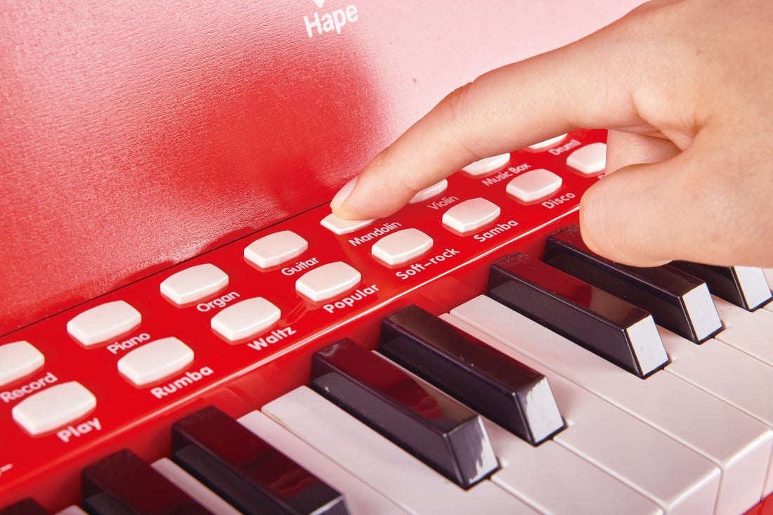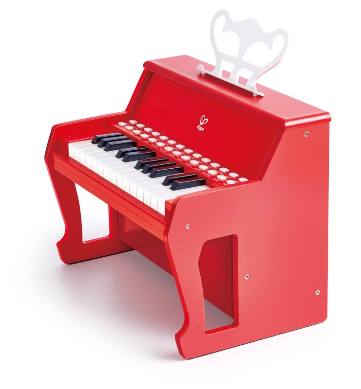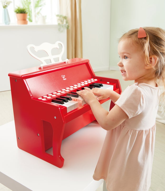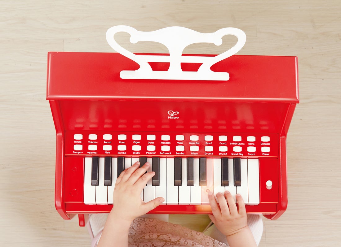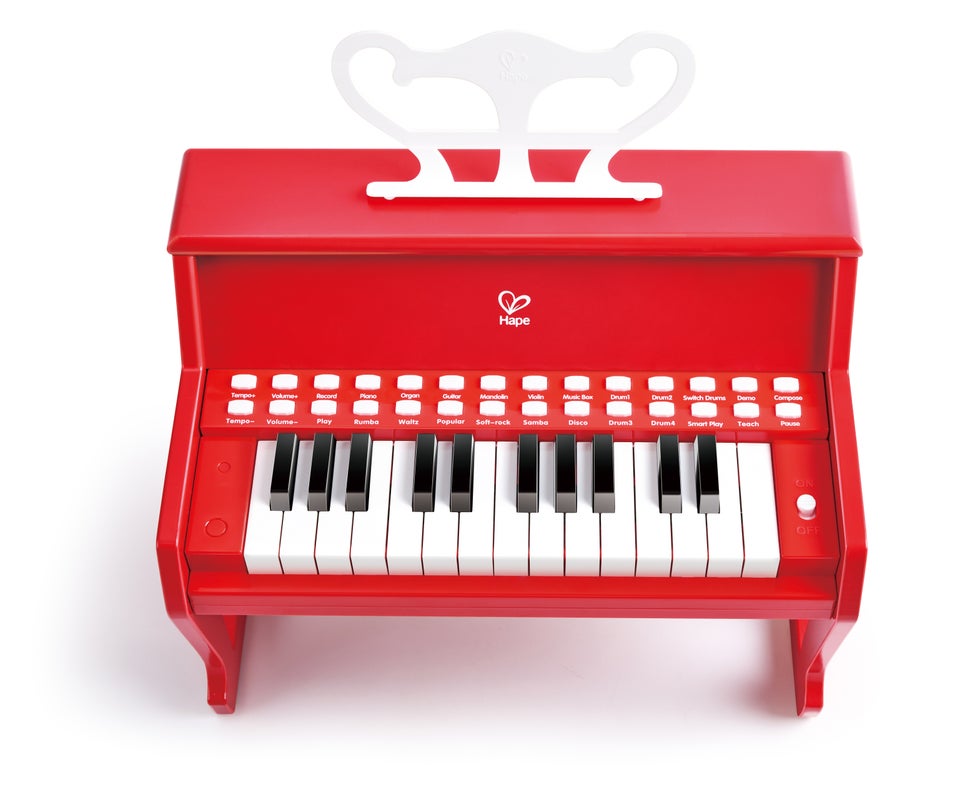 This 25-key electric piano is a wonderful way to begin your musical journey. Folllow the light-up keys to learn how to play! Then you can select your own instrument and play along to one of the six stylized tunes and eight drum beats. Follow the light-up keys to learn how to play! When you`re more confident you can select one instrument then play along to one of the six stylized tunes and eight drum beats as well as recording and playing back your own work! Play-along, 25-key electric piano with light-up keysFollow the light-up keys to learn how to play, then when you`re more confident you can select your own instrument and play along to one of the six stylized accompanying tunes and eight drum beats with adjustable tempos Includes 15 demo tunes. Select the Smart Play function and any key you hit will play the correct note so you can pretend to play alongnu2022 Record & playback function lets you hear what you`ve played! Great for encouraging creativity and the perfect preparation for advanced musical learning. The perfect way to build confidence in younger musicians Plug in using the included cable or use batteries. If not used for three minutes after the background music finishes, the piano will make a sound to remind you and then enter rest mode. Press any key to re-activate