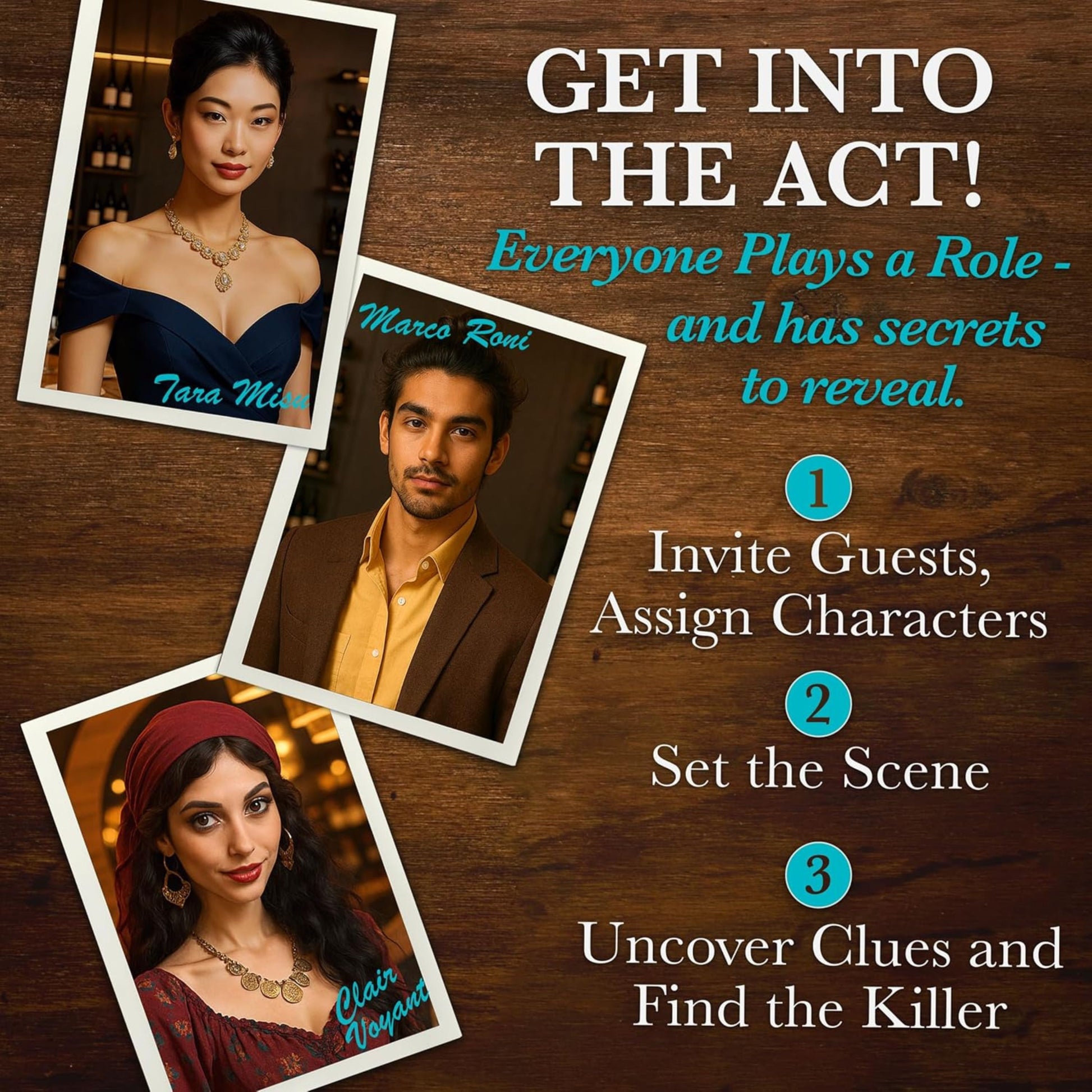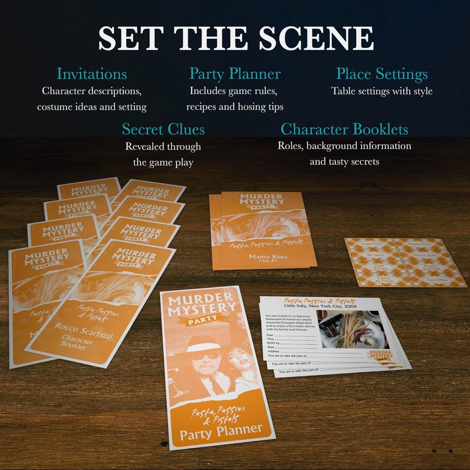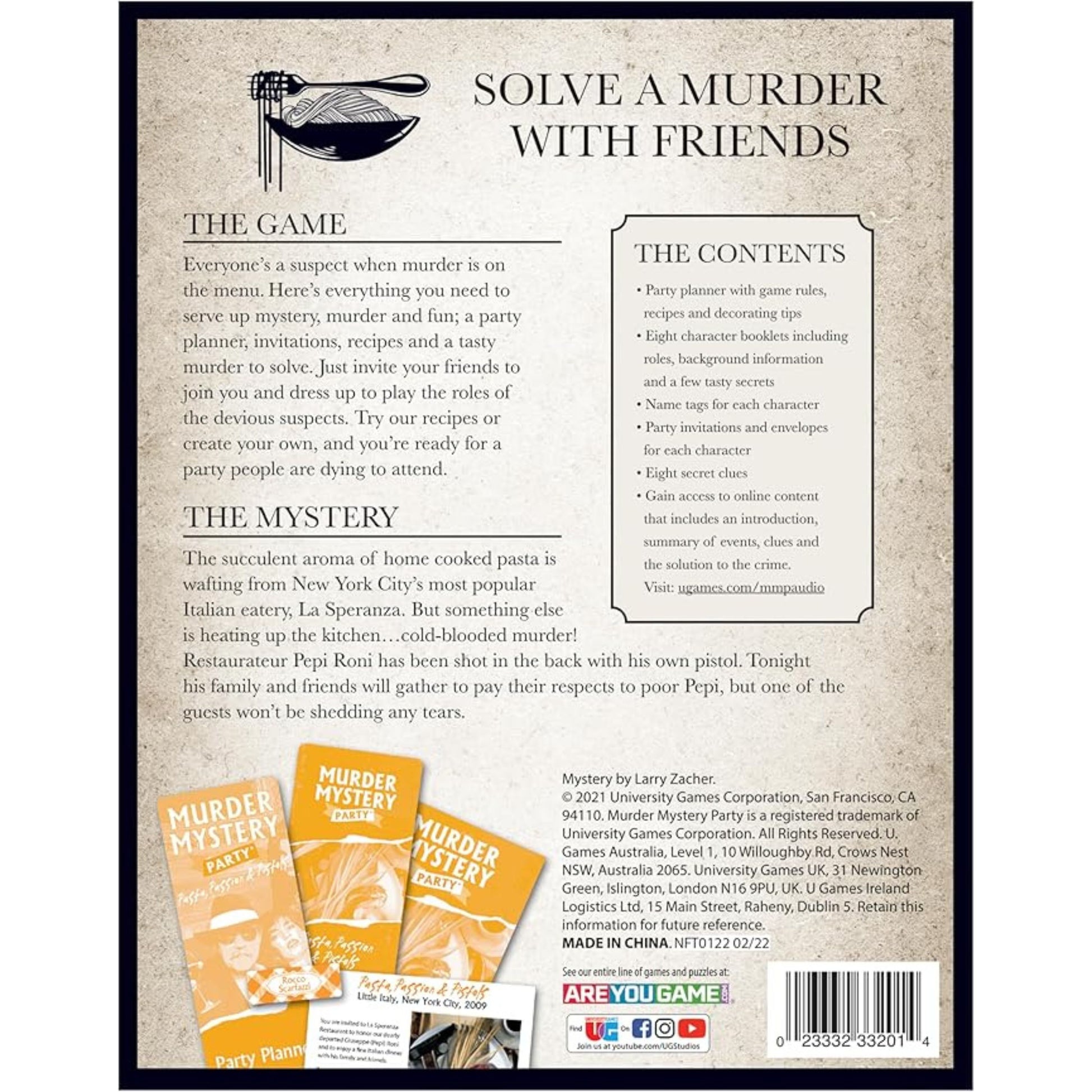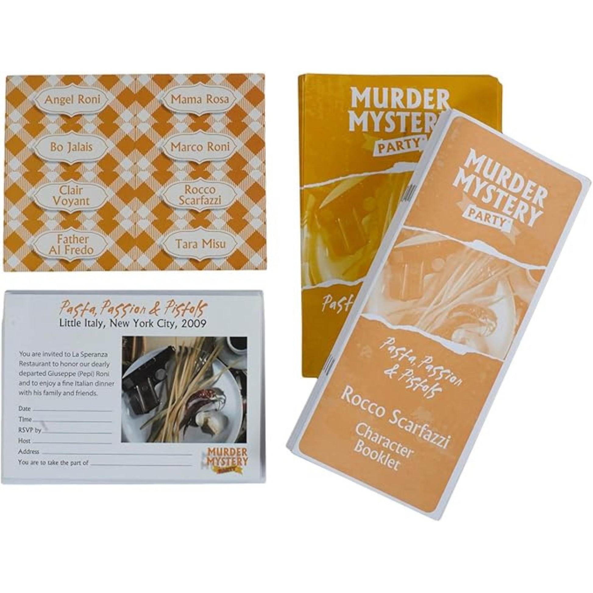 veryone's a suspect when murder is on the menu. The aroma of home cooked pasta is drifting from New York City's most popular Italian eatery, but something else is heating up the kitchen as the Restauranteur has been shot. Family and friends will gather to pay their respects, but one of the guests won't be shedding any tears. This mystery dinner party game for adults includes recipes, a shopping list, invitations plus a tasty murder mystery to solve. Each player dresses up and plays the role of a