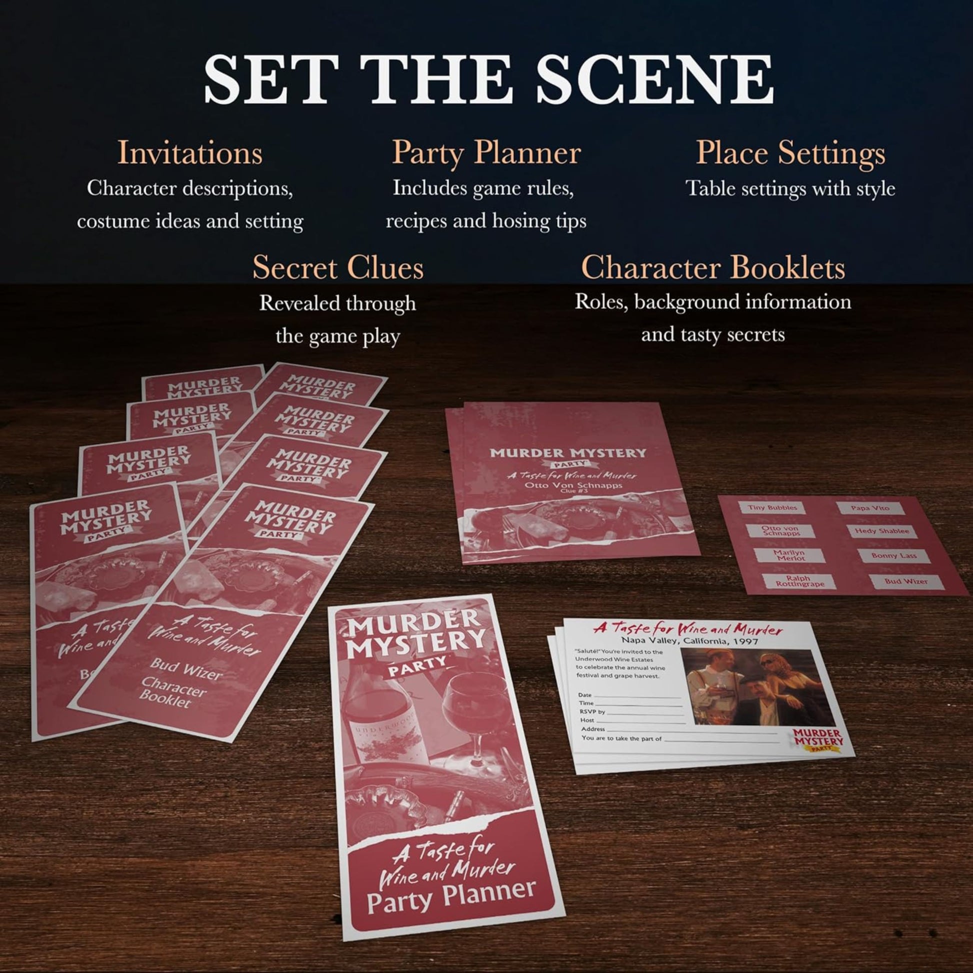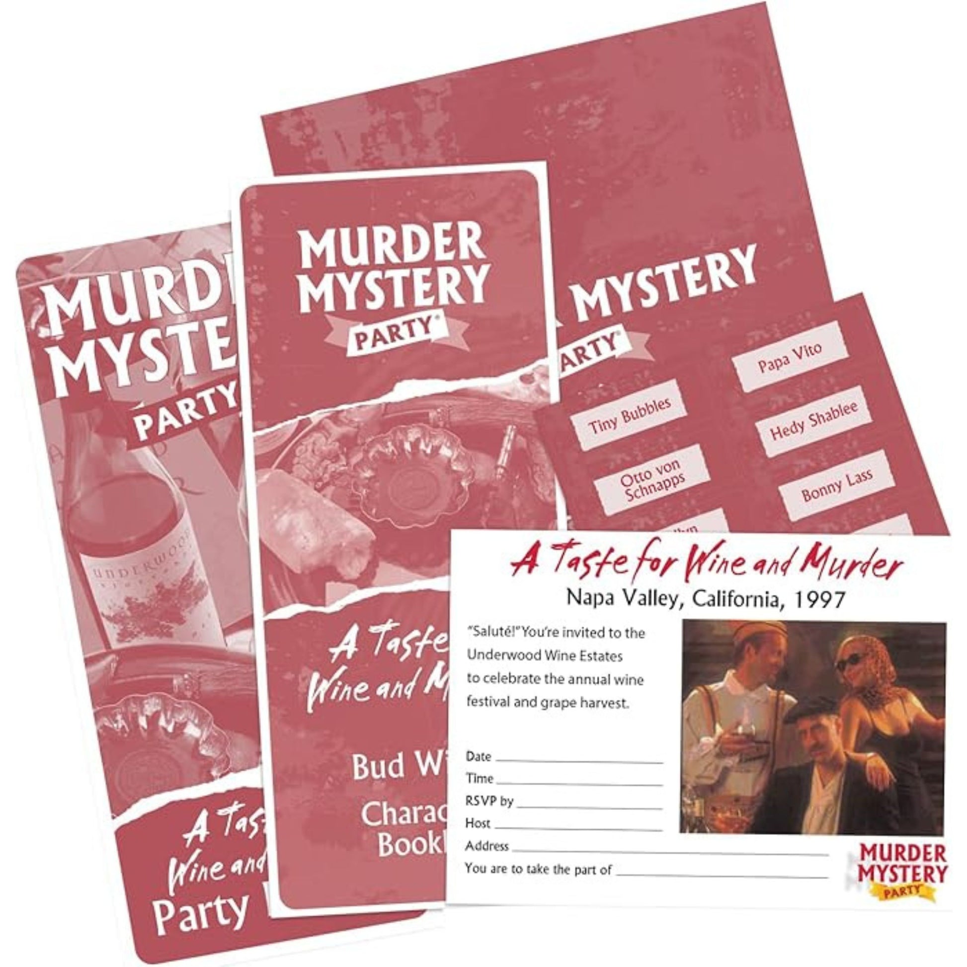 Put on your own mystery dinner theater: murder's on the menu, and everyone's a suspect in this grownup game for 6 to 8 players. The game includes everything you need to serve up mystery, murder, and fun: a shopping list, menus, recipes by cookbook author Sandra Gluck, eight party invitations and envelopes, place cards, secret clues and, best of all, a murder mystery to solve. The annual wine-tasting festival in California Wine Country is in full swing when the body of local vineyard owner, Barry Underwood, is found hidden beneath his wine cellar. Barry