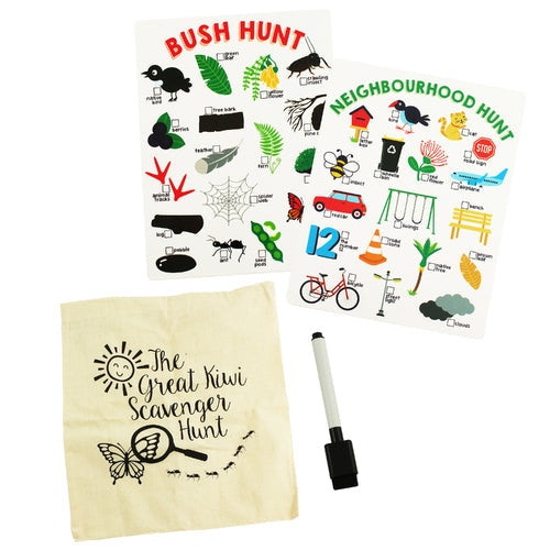 Perfect entertainment for the kids, indoors or out! This Scavenger Hunt set features 2 erasable game boardsand 2 black whiteboard markers. Search through vibrant images of the items and tick them off. A handy calico drawstring bag is also included for collecting the items found and for storing the game boards and markers in when you've finished. Change it up and play over and over again! Perfect for one child or more.
