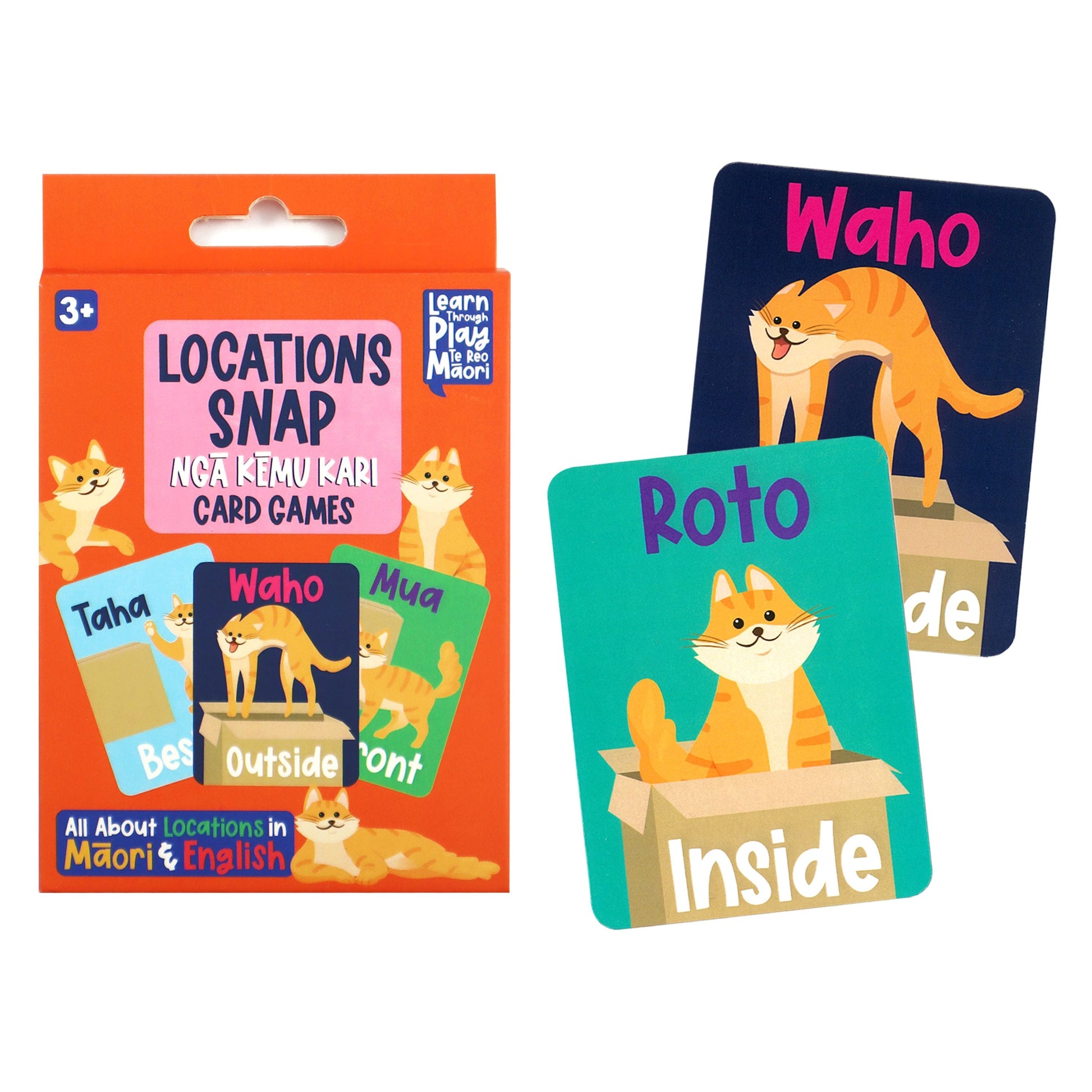 Explore the use of location words in Te Reo by playing the classic card game of snap. This Te Reo card game is part of the Learn Through Play series, promoting the use of Te Reo Maori in everyday life. Follow along the playful cat as he explores the cardboard boxes. While this game follows the standard rules, it includes a subtle twist to make learning and practice enjoyable for players.