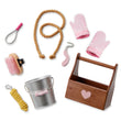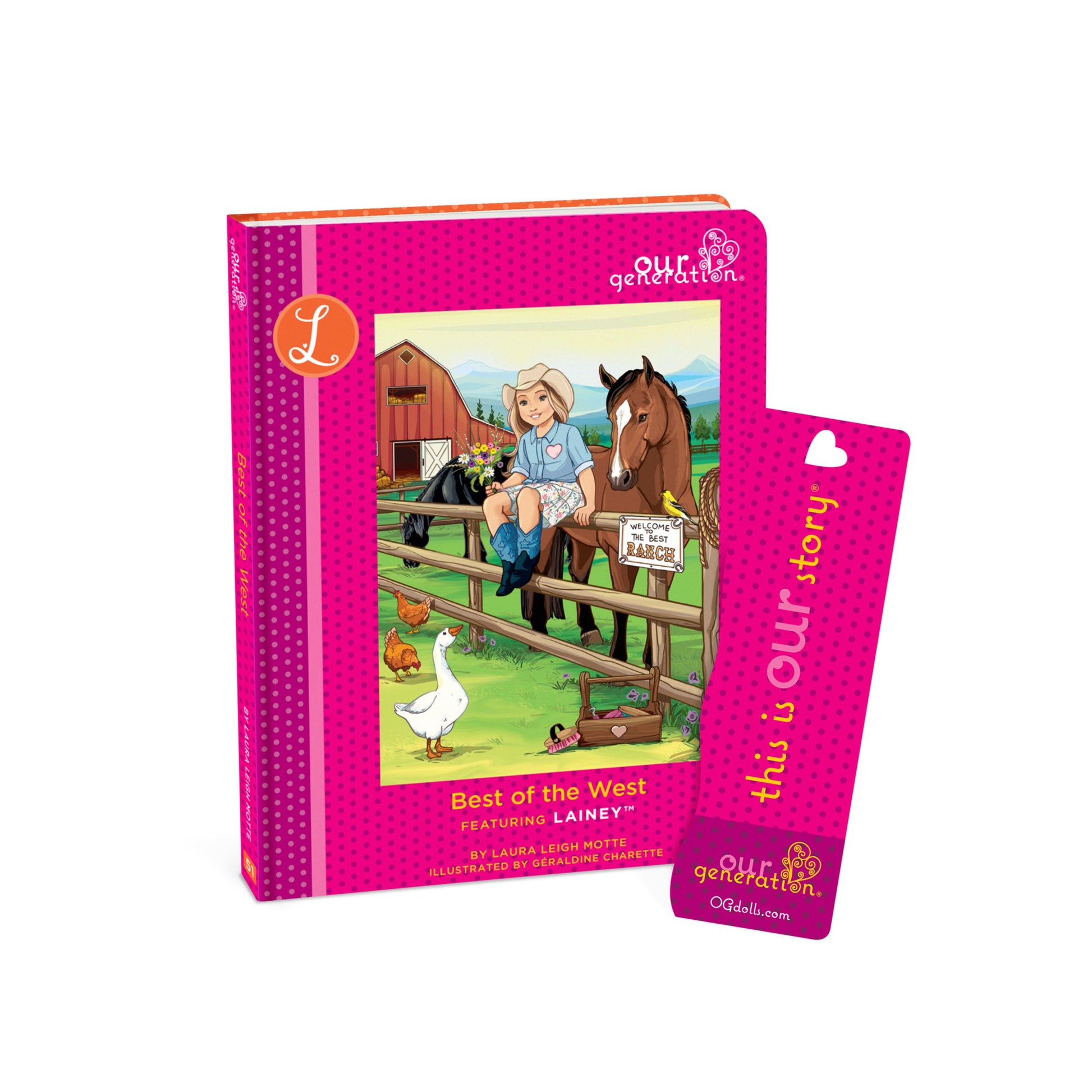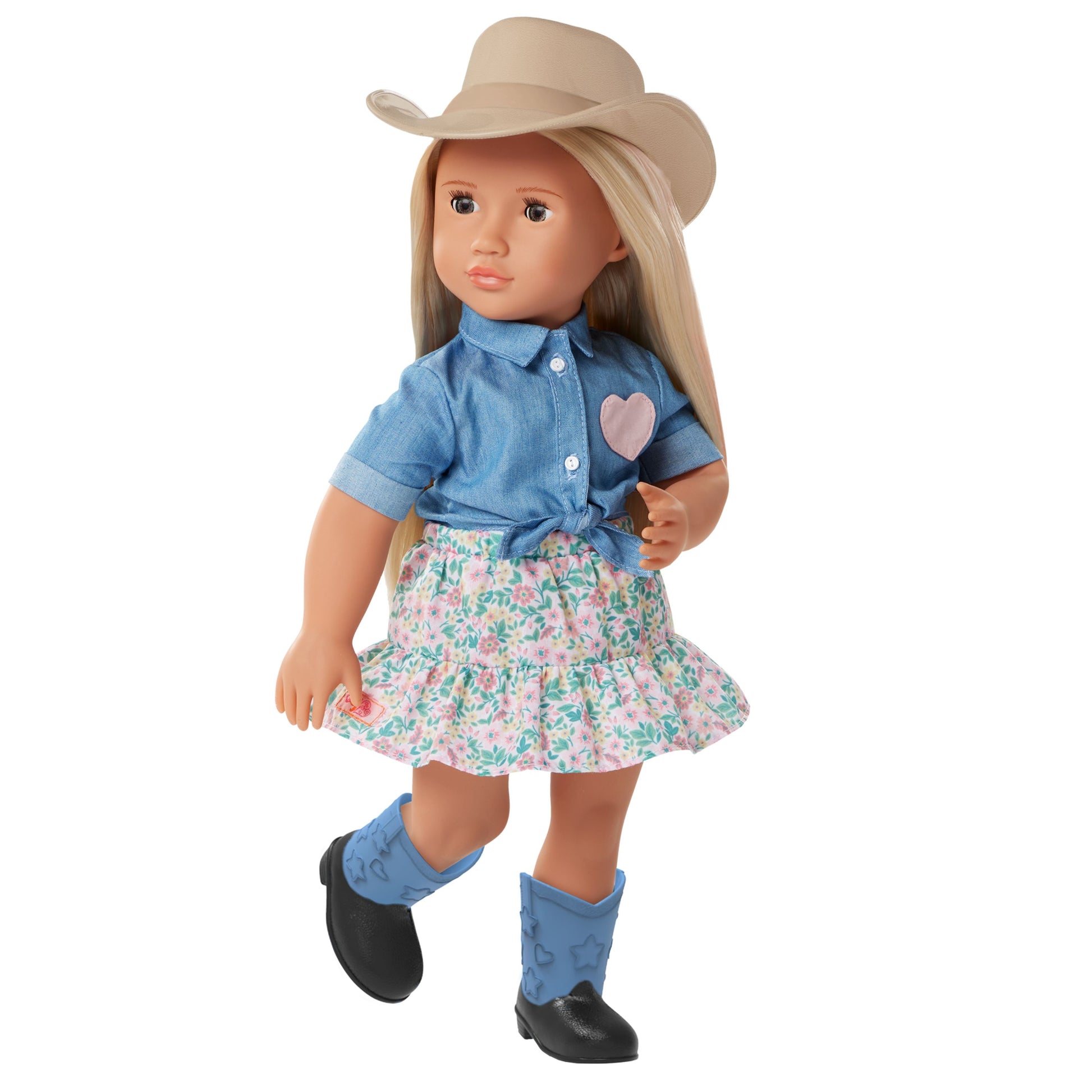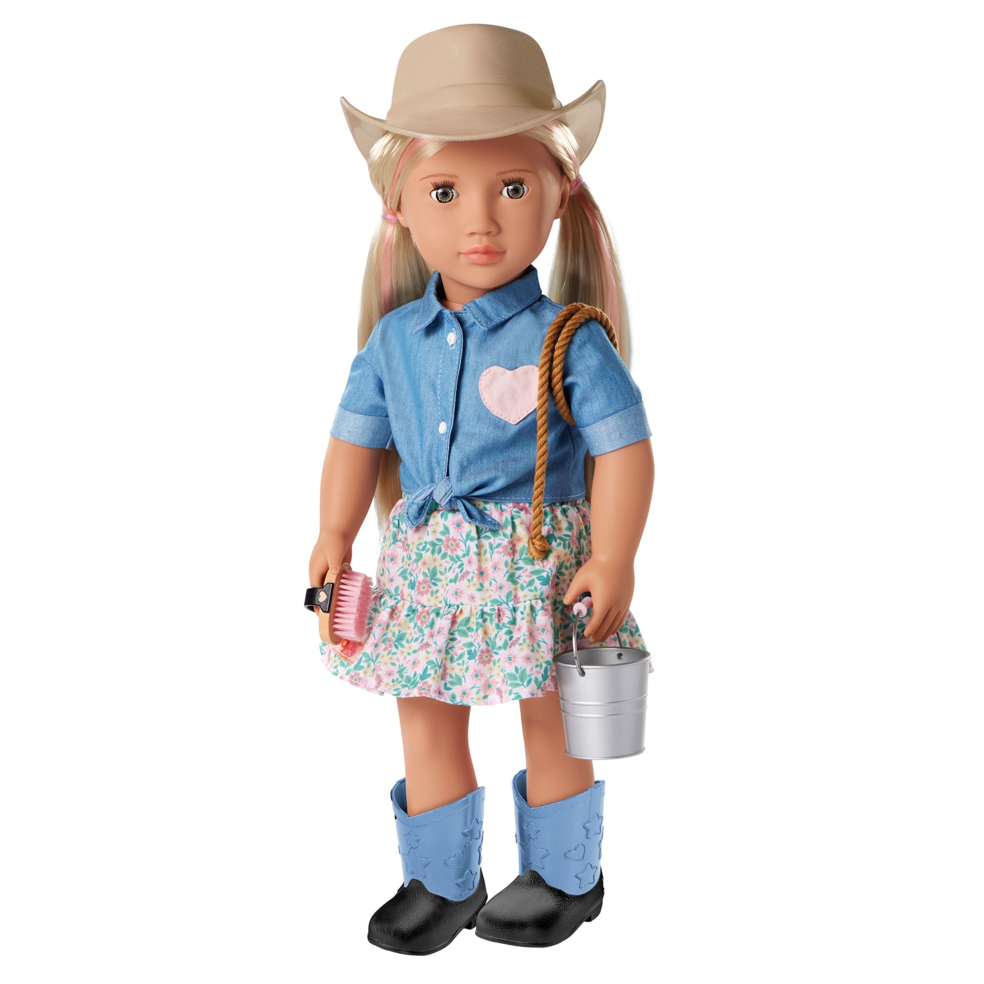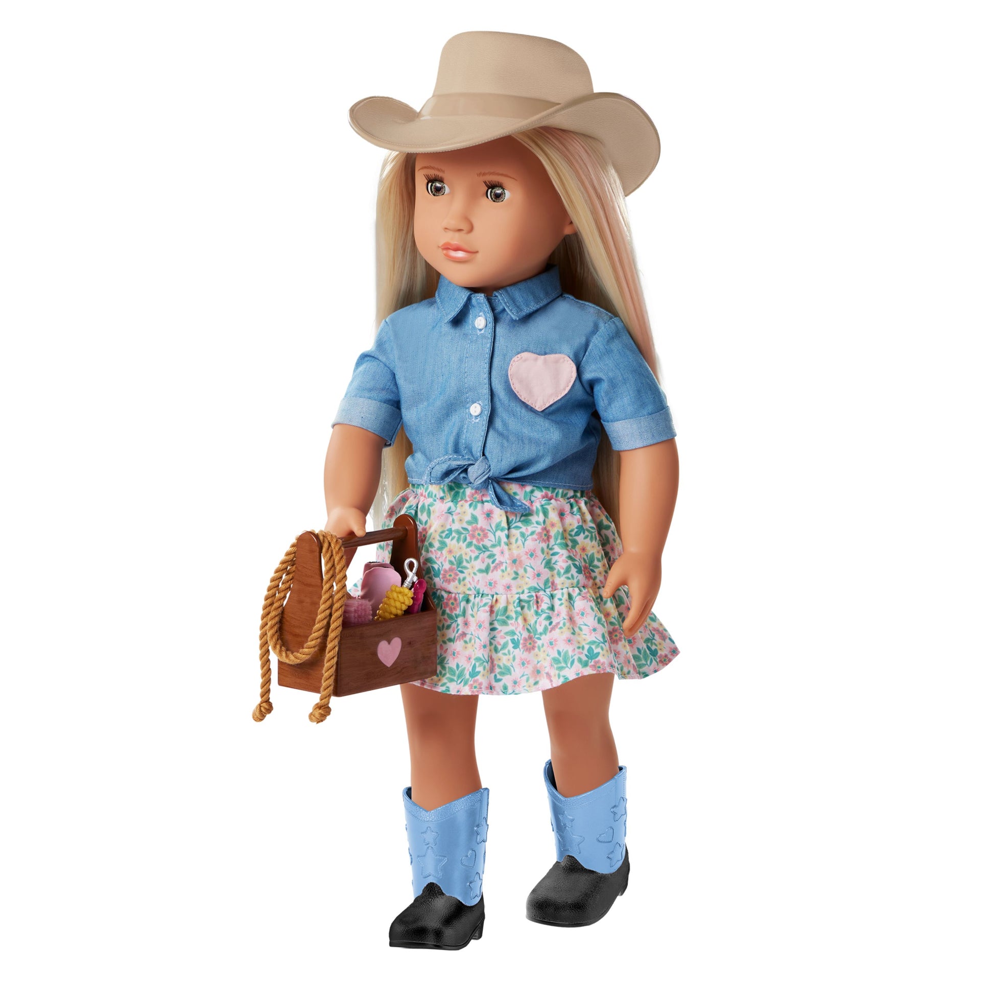 Saddle up for acres of adventures with Our Generation 46cm doll Lainey and her storybook! A brave cowgirl at heart, Lainey is heading west to visit her family ranch in Montana. She'll meet new cousins, make new animal friends, and face new challenges too. Is she nervous? Not a chance! Her opportunity has finally arrived, and nothing will get in her way - not a mean goose, a spooked horse, or a grandpa with very strong opinions. Y'all ready for the ride? Lainey wears a stylish country outfit featuring a denim-style top with a pink heart and tie-front details, a floral skirt, a cowboy hat, and two-toned riding boots adorned with hearts and stars. Her bendable arms and legs inspire added poses and make her the perfect partner for riding Our Generation horses! Themed accessories like riding gloves, a shedder scraper, rope tether, hoof pick, rope, a bucket, a brush, and a storage basket complete the set and let kids recreate their own adventures. Our Generation dolls make a great gift for kids 3 years old and up (small parts). Compatible with most 46cm dolls, doll clothes, and doll accessories.