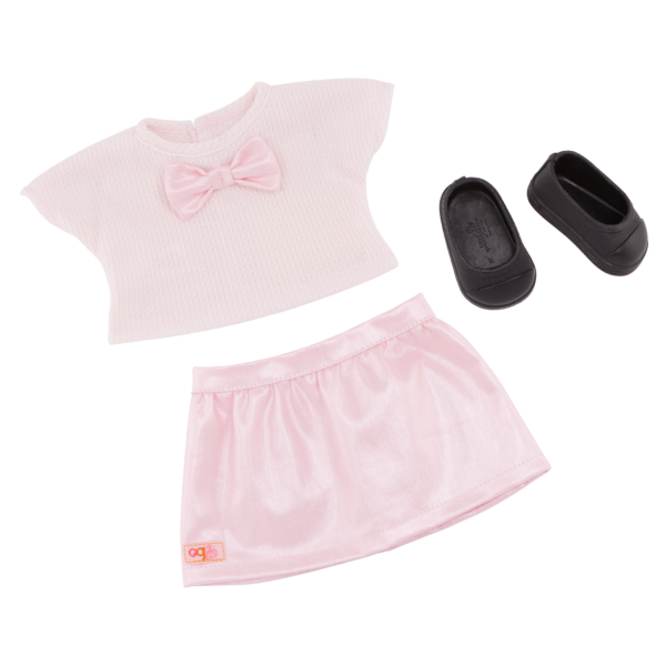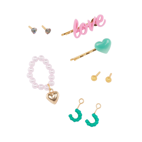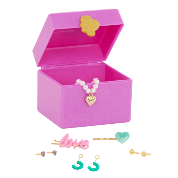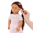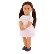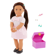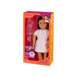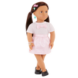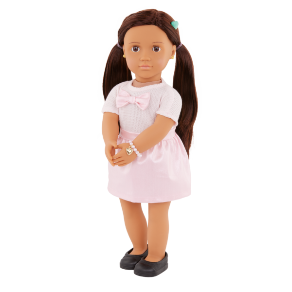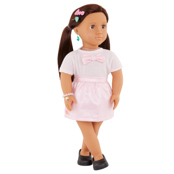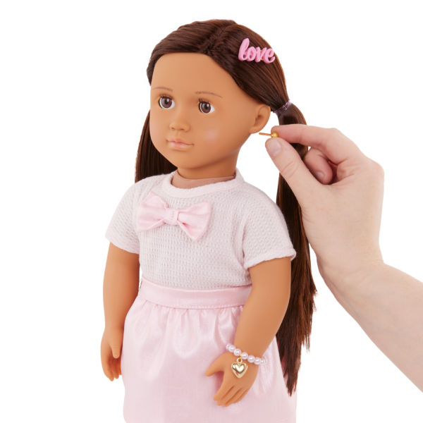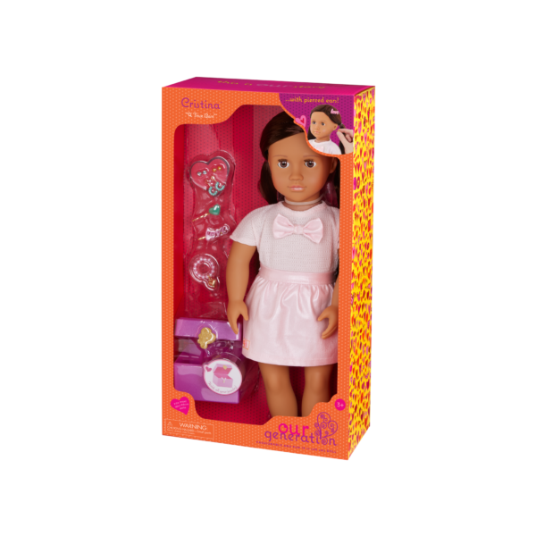 Create sparkling styles with Cristina and her jewelry collection! This Our Generation 18-inch doll has a huggable soft body and lifelike features. She has beautiful brown eyes that open and close, long brunette hair to style, and pierced ears so she can wear her earrings! Which jewelry piece will you accessorize with first? Choose between the beaded bracelet, 2 pairs of earrings, hoop pendants, and 2 bobby pins to make Cristina shine. She even comes with a jewelry box to store her collection! Cristina arrives wearing a light-pink outfit, including a top with a decorative bow and a metallic pink skirt. When it’s time for dress-up, her outfit has easy-open closures to quickly put on and remove. So you can style Cristina in more of your favorite looks!